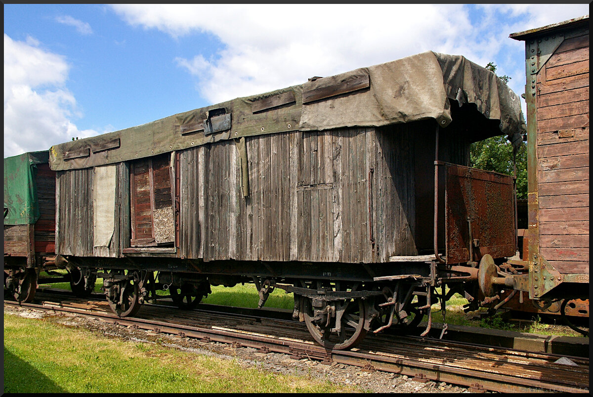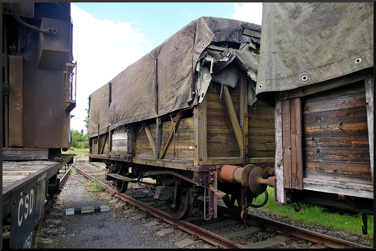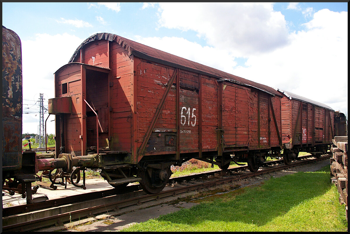 Dieser 2-achsige gedeckte Güterwagen ohne Nummer mit Lüftungsgittern und einer Plattform stand am 21.05.2022 im Eisenbahnmuseum Jaroměř.