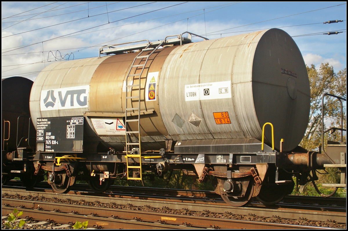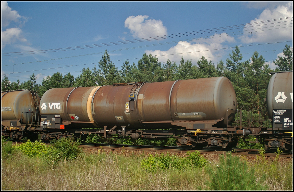 Vierachsiger Drehgestellkesselwagen der Gattung Zacns zum Transport von Wasserstoffperoxyd des Einstellers VTG, der in einem Zug weiterer Kesselwagen nach Bad Hönningen am 09.08.2010 durch Magdeburg-Neustadt fuhr (33 TEN-RIV 84 NL-VTGD 7846 401-3 Zacns)