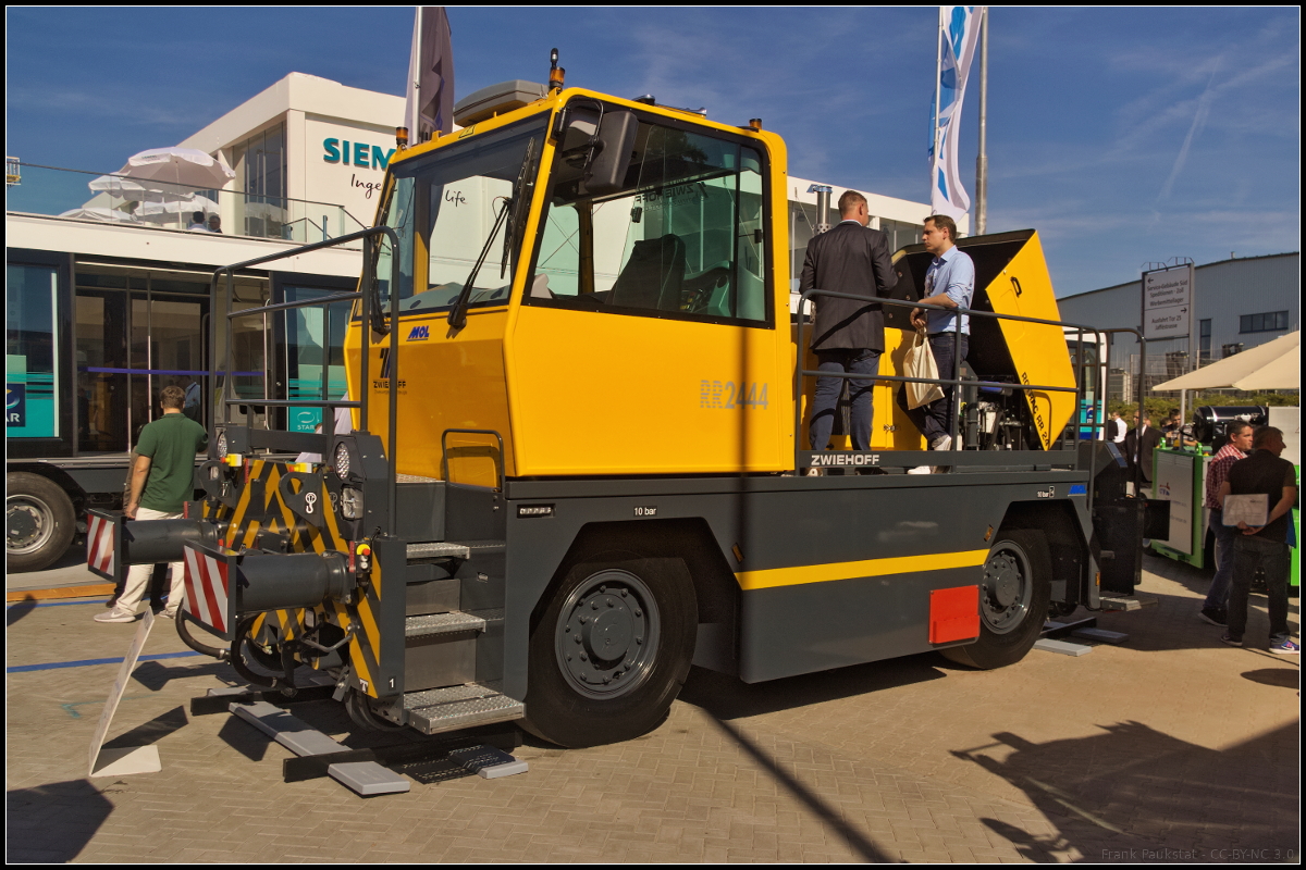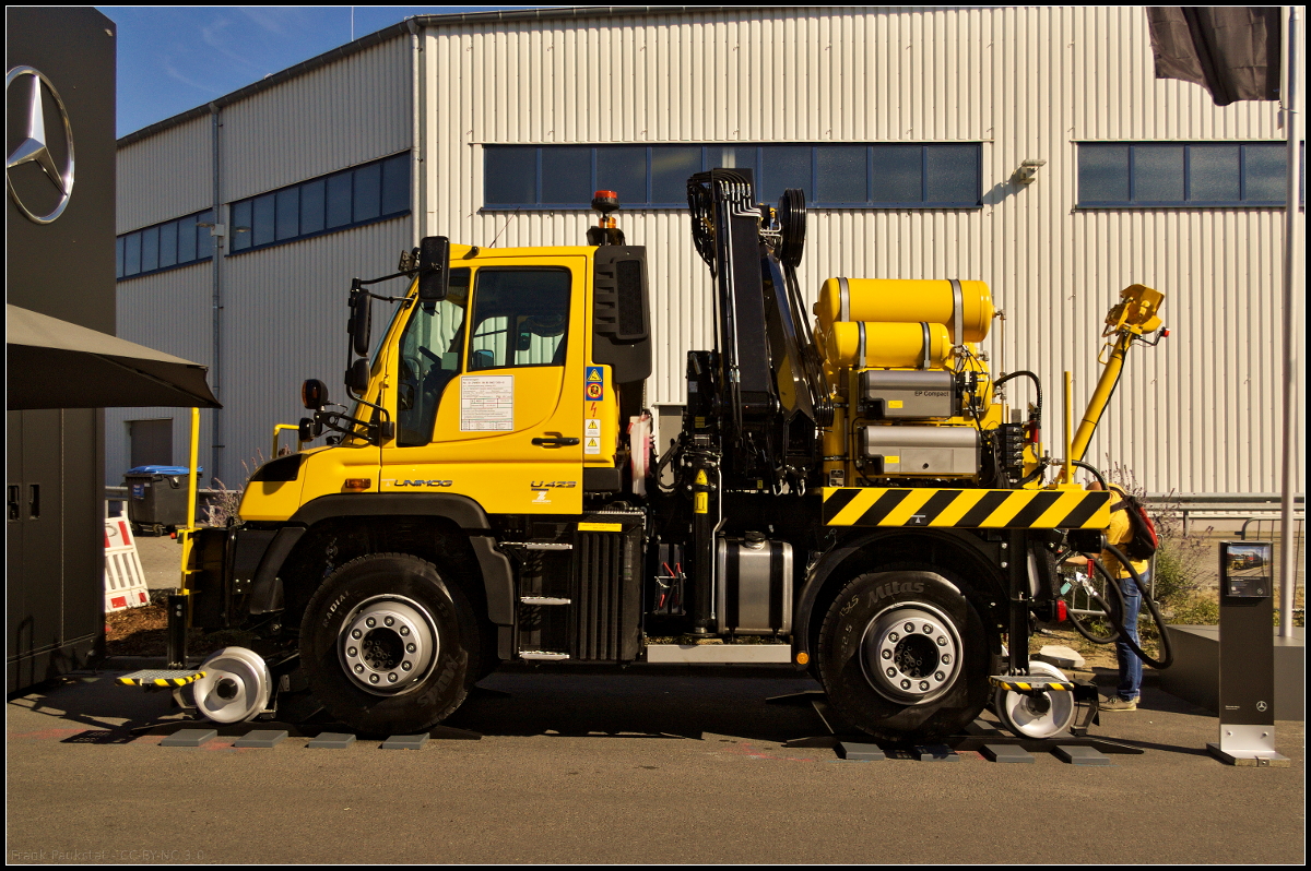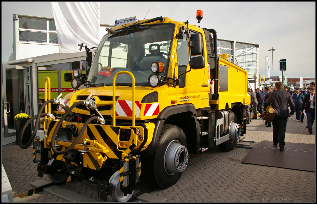 InnoTrans 2016 in Berlin: Von der Firma Zwiehoff kommt dieses Zweiwege-Rangierfahrzeug auf der Basis des neuen Unimog U 423. Er kann schwere Rangierarbeiten bis 1000 t Anhängelast durchführen, mit Hilfe der Wandlerschaltkupplung ist ruckelfreies Arbeiten möglich. Als Rangierfahrzeug besitzt das Fahrzeug neben der Signallicht- und Warnanlage eine Eisebahnwagen-Bremsanlage für 400, 600 oder 800 t. Da die Luftbehälter schnell befüllt werden können, sind geringe Standzeiten gegeben. Die Kupplungseinrichtung gibt es in mechanischer, automatischer, gedämpft mit Hochschwenkeinrichtung oder als Sonderlösung nach Kundenwunsch. Eine Funkfernsteuerung ist optional.