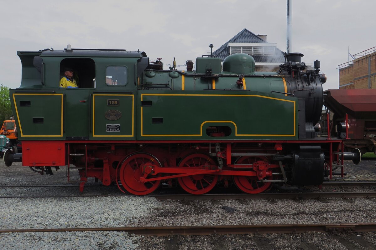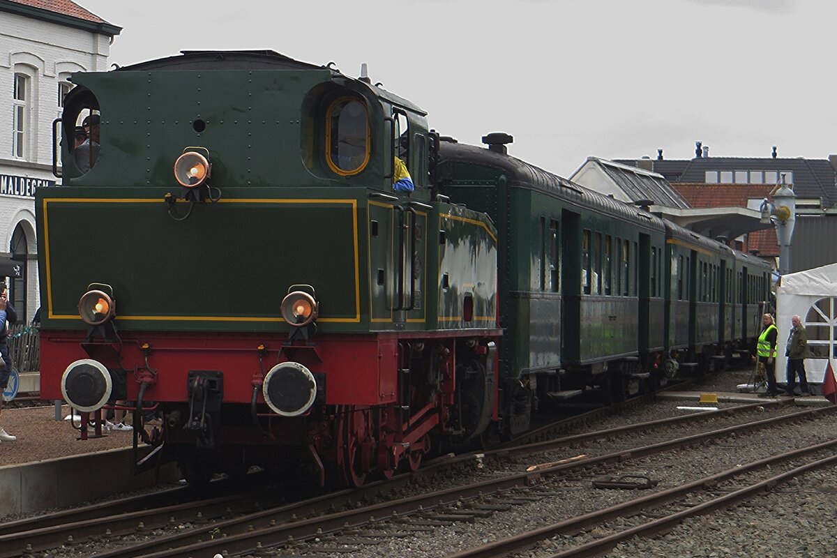 Dampfkleinloklein YVONNE aus Maldegem töfft hin-und-her auf das Gelände der CFV3V in Mariembourg am 22 September 2023. Die CFV3V hat 50.Geburtstag/-wochenende, deswegen der weisse Aufkleber.