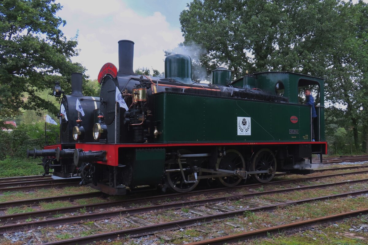 Ex-Hoogovens Lok 22 TOM steht am 6 Mai 2023 mit ein Dampfpendelzug in Maldegem während das Dampfwochenende der SCMs. Wegen Kontroversen über Umweltfeindliche Gasausstösse entscheidete Tata Steel (ehemahlige Hoogovens) die zwei für Exkursionen eingesetzte Dampfloks 'TOM' und 'BONNE' los zu werden; TOM hat ins SCM ein vorlaufiges neues Heimat gefunden.