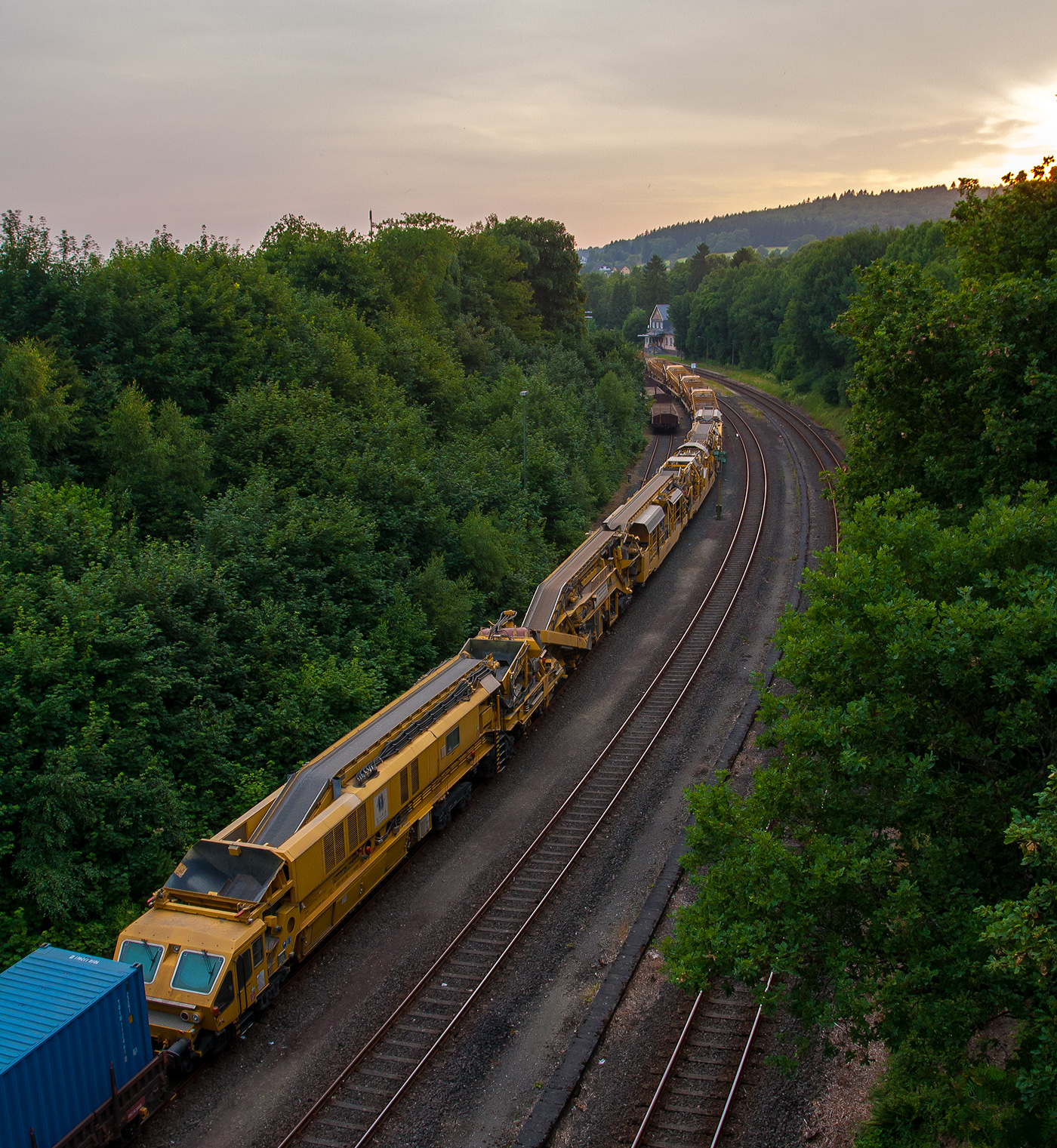 Die an die BEG - Bocholter Eisenbahngesellschaft mbH vermietete 275 103-0 (92 80 1275 103-0 D-NRAIL) eine Vossloh G 1206 der Northrail fährt am 22.10.2021 mit einem langen Bauzug der MGW Gleis- und Weichenbau-GmbH & Co. KG (Berlin) durch Betzdorf (Sieg) in Richtung Siegen. Der Bauzug bestand aus acht Plasser & Theurer Materialförder- und Siloeinheit MFS 100, der Plasser & Theurer Bettungsreinigungsmaschine RM 95-700, sowie zwei Schutzwagen.
