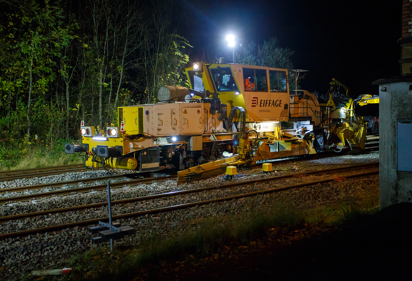Die Plasser & Theurer Schnell-Schotterverteil- und Planiermaschine SSP 110 SW, Schweres Nebenfahrzeug Nr. D-SPAG 99 80 9425 026-8 gekuppelt mit einer Plasser & Theurer Universalstopfmaschine UNIMAT 09-4×4/4S, beide der SPITZKE SE (Großbeeren) sind am 13 September 2025 im Rbf Betzdorf/Sieg abgestellt.