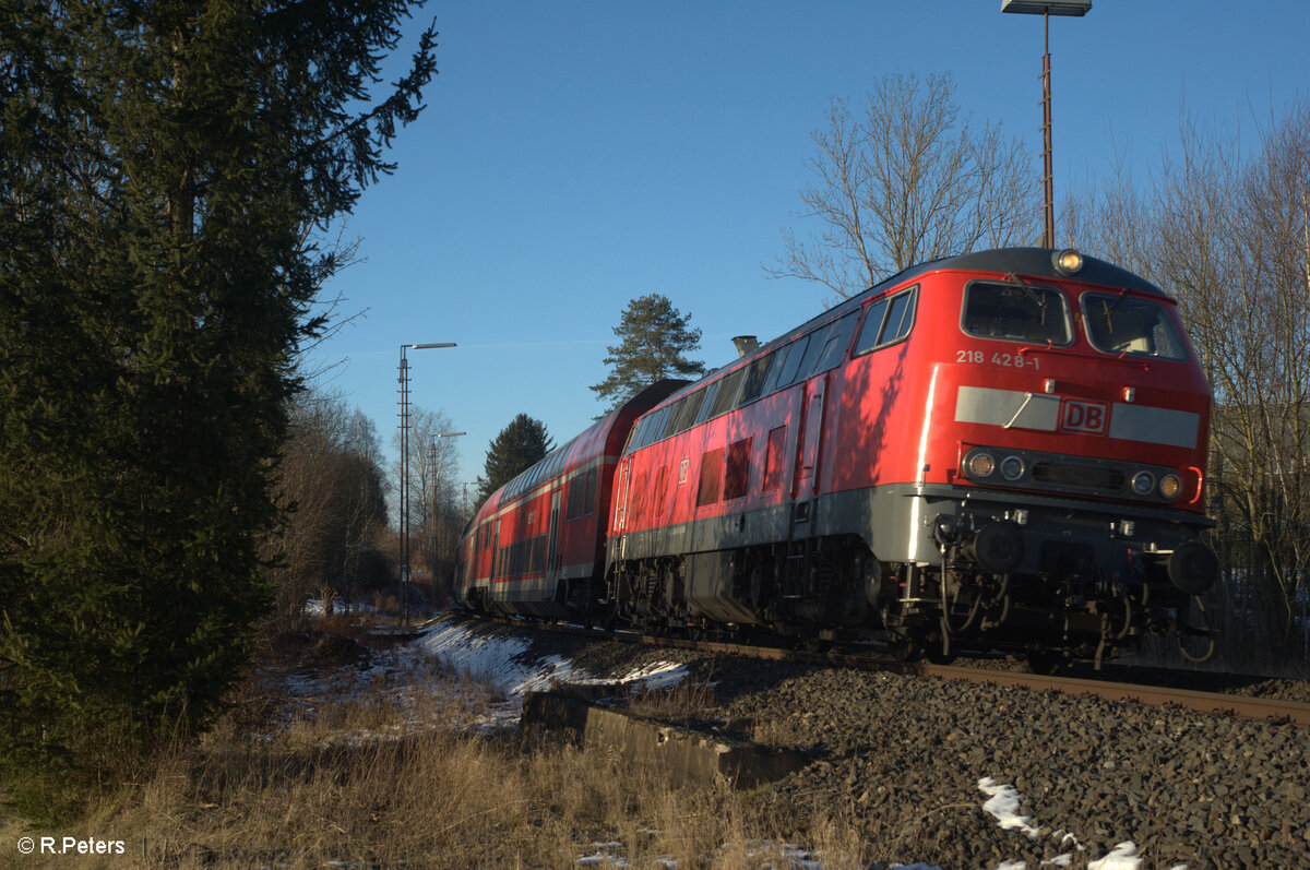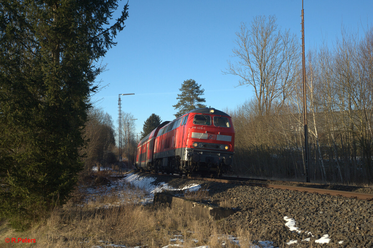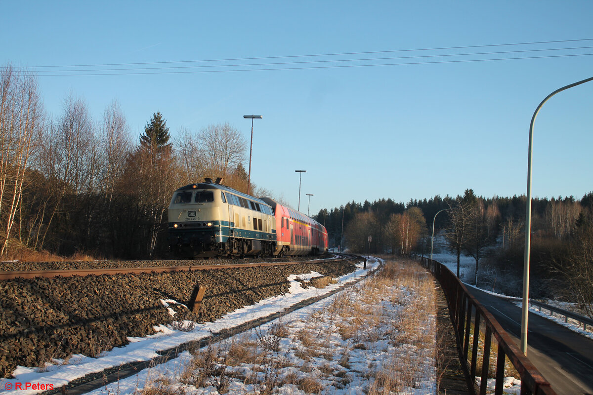 218 443 "Donna" zieht mit dem RE2 4854 München - Hof am trocken gelegten Rechenweiher vorbei. 07.07.24