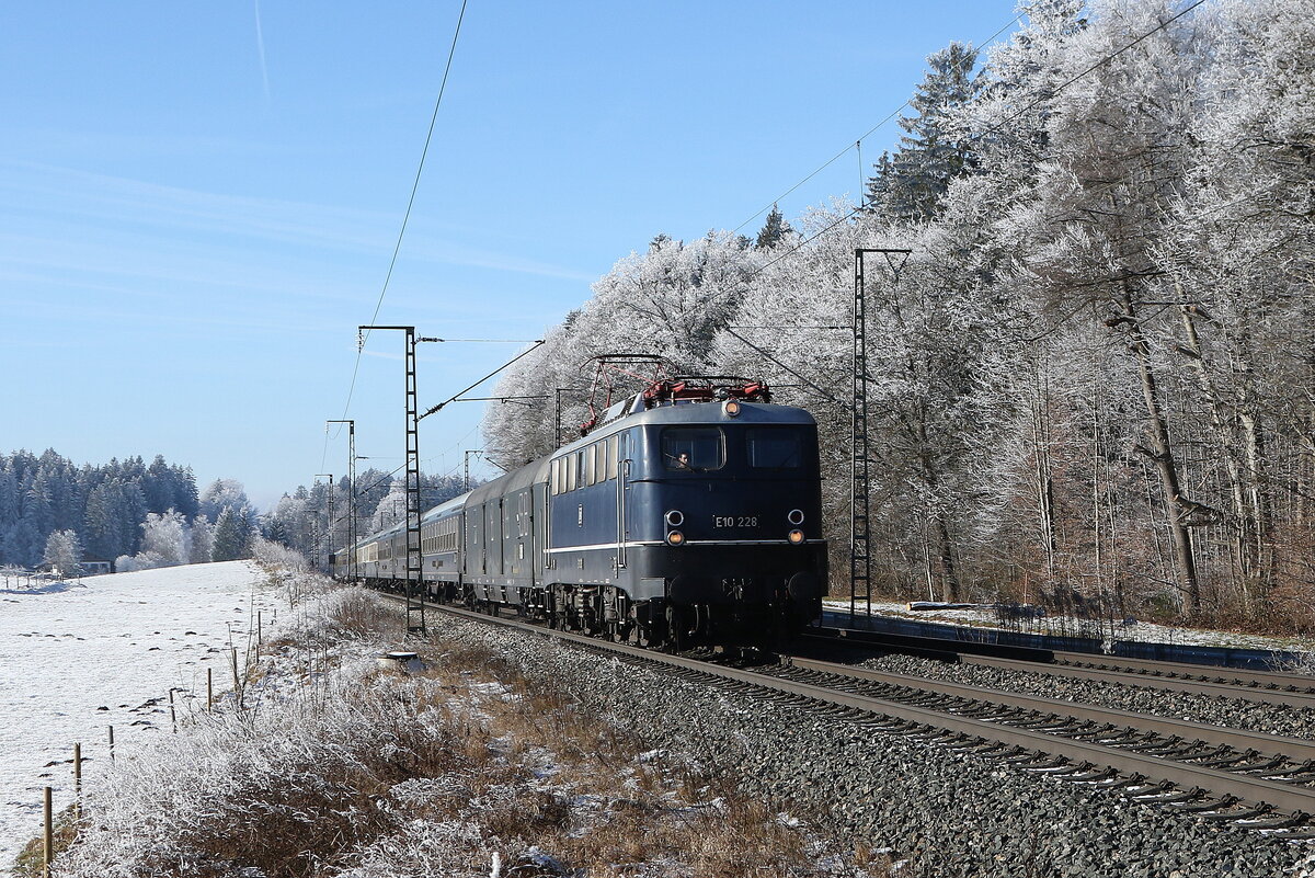 E10 1309 war am 29. Dezember 2016 mit dem "AKE-Rheingold" von Köln zum Wörthersee unterwegs. Aufgenommen bei Bernau am Chiemsee.