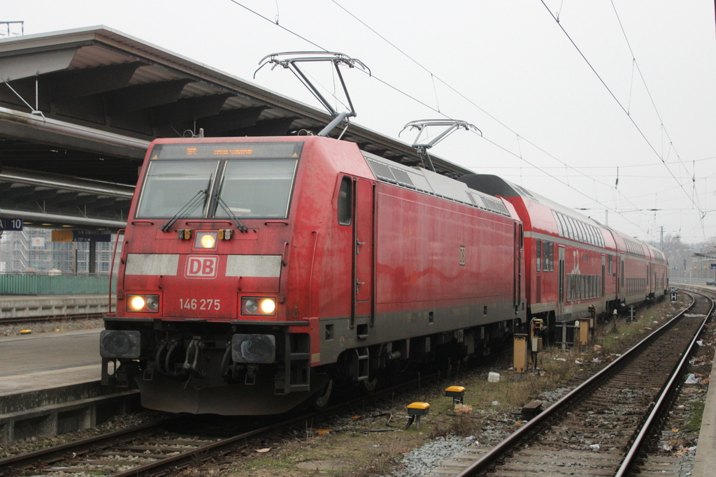 146 275 mit RE 5 von Rostock Hbf nach Berlin-Südkreuz kurz vor der Ausfahrt im Rostocker Hbf.23.01.2026