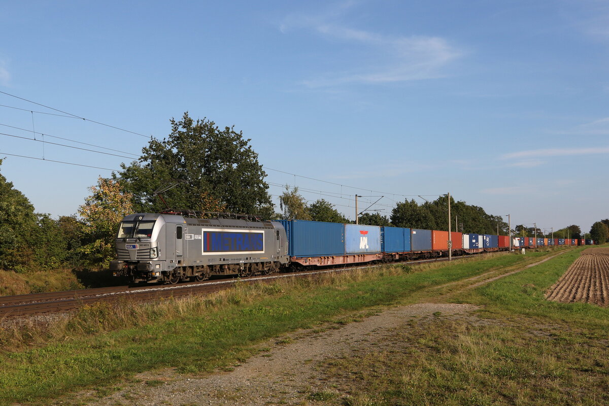 187 510 von "METRANS" mit einem Containerzug am 27. August 2019 bei Hermannspiegel in Hessen.