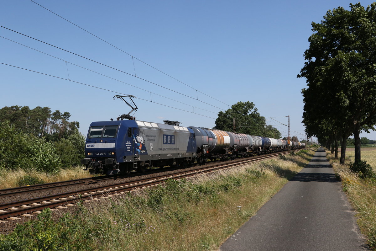 145 027 mit einem Containerzug am 6. August 2022 bei Himmelstadt am Main.
