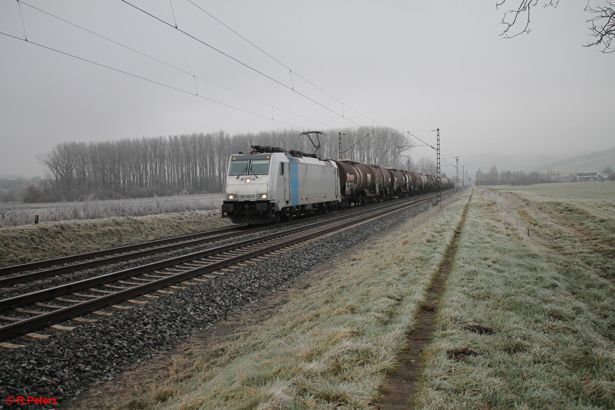 186 300-0 zieht bei Retzbach-Zellingen ein Kesselzug in Richtung Süden. 28.12.24