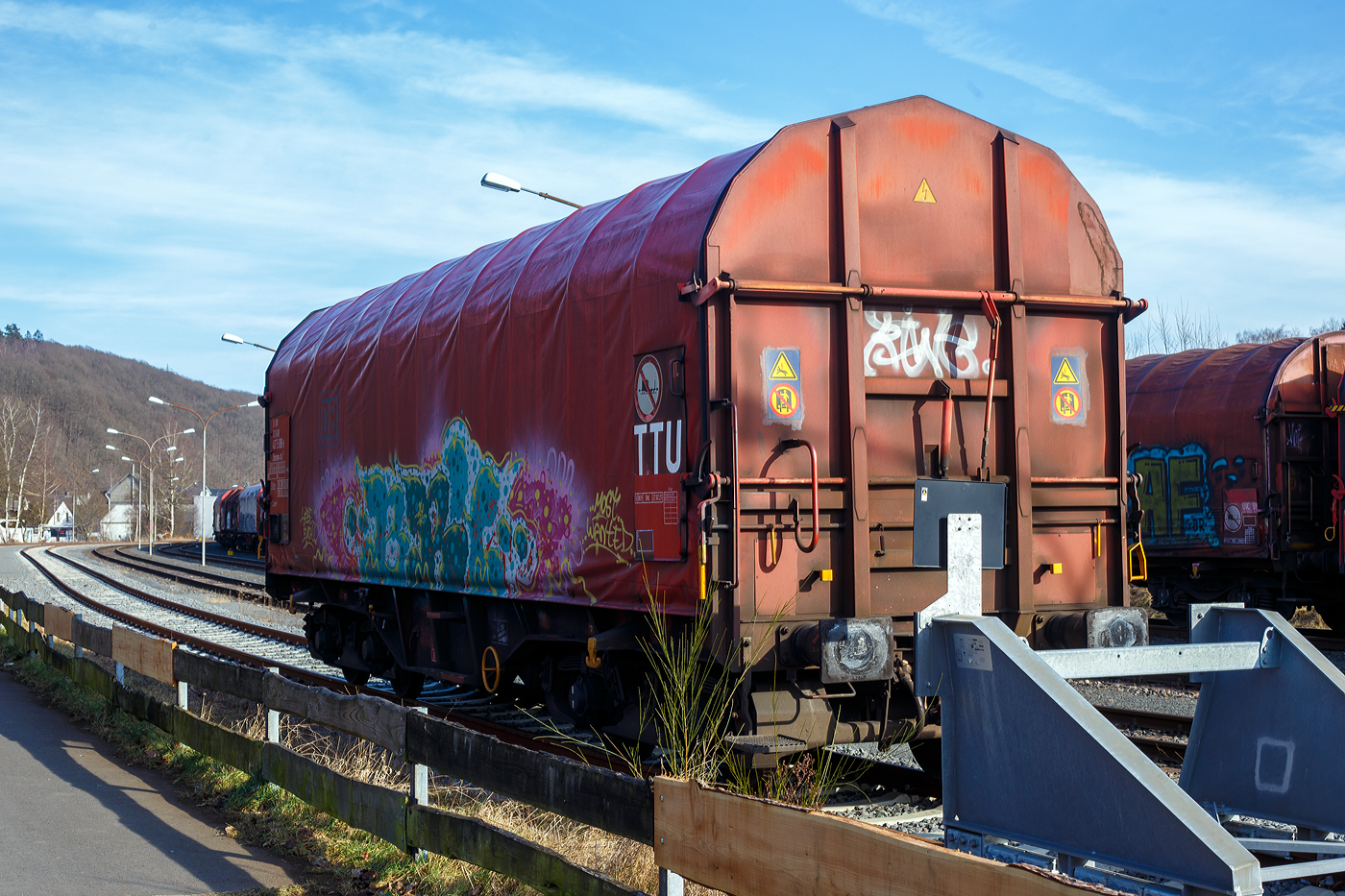 Und tschüss bis gleich in Herdorf, der vierachsiger Drehgestell-Flachwagen mit verschiebbarem Planenverdeck und Lademulden für Coiltransporte, 37 80 4668 122-7 D-VTG, der Gattung Shimmns-ttu (VTG Bez. F46.520D), der VTG Rail Europe GmbH (Hamburg), am 03 Juli 2024 eigereiht im Zugverband (Zudschluss) der KSW bei einer in Zugdurchfahrt im Bf Scheuerfeld/Sieg, in Richtung Herdorf via Betzdorf.