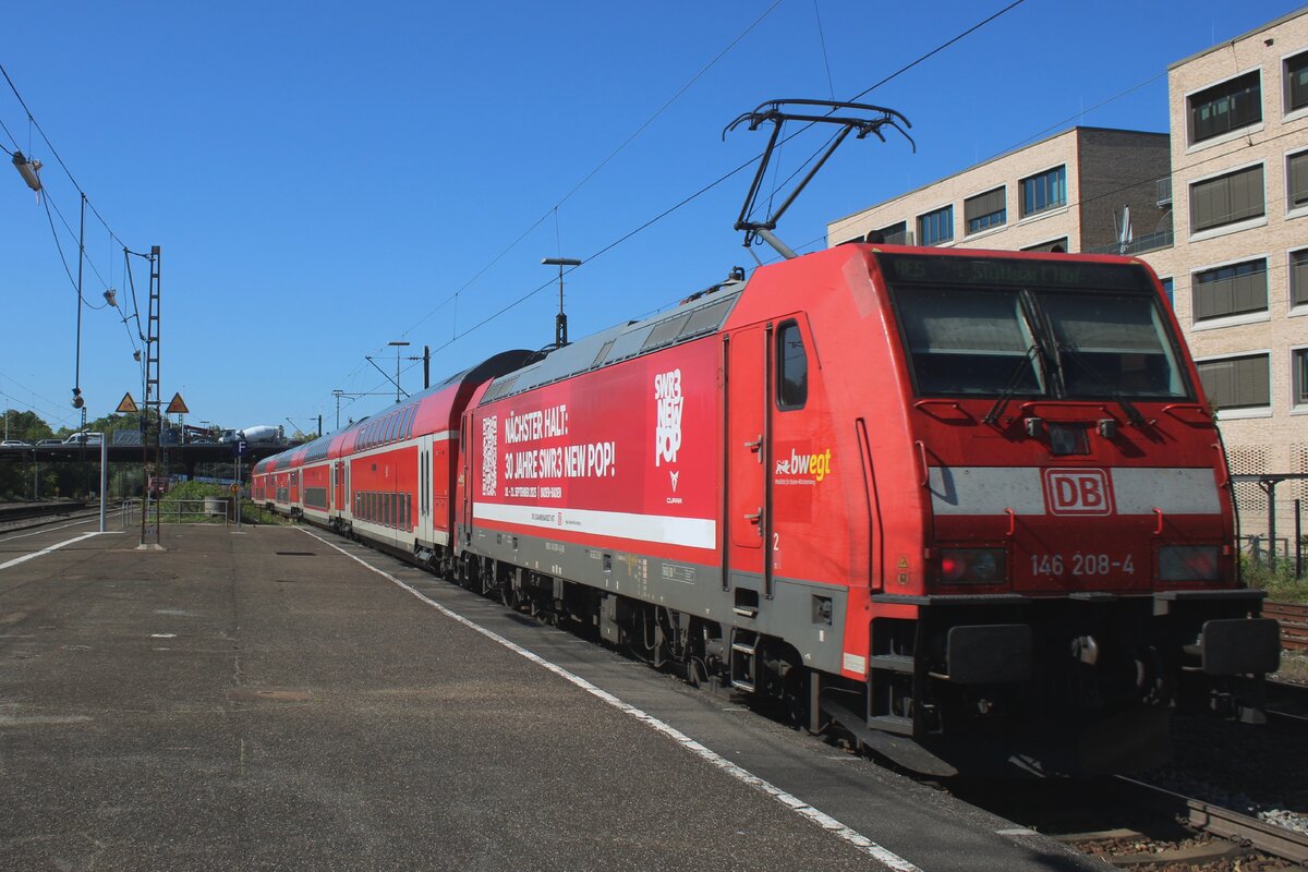 Während recht die DB 146 275 mit dem RE 1 "Hanse-Express" nach Hamburg (Rostock - Schwerin - Hamburg) steht, rauscht Steuerwagen voraus der IC 2213 (Ostseebad Binz - Hamburg – Stuttgart) in Richtung Hamburg durch den Bahnhof. Der IC mit Werbung „50 Jahre Intercity“, Schublok war die 101 110-5 und hier vorne der modernisierte klimatisierte 2. Klasse InterCity-Steuerwagen D-DB 61 80 80-91 101-8 der Bauart Bpmmbdzf 286.1 (ex Bpmbdzf 296.1).