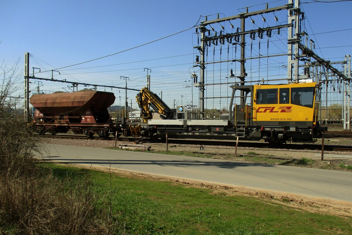 Nachschuss auf CFL Robbel 711 + 714, diese ziehen einen Wagenzug mit Schienen durch die Haltestelle Drauffelt.