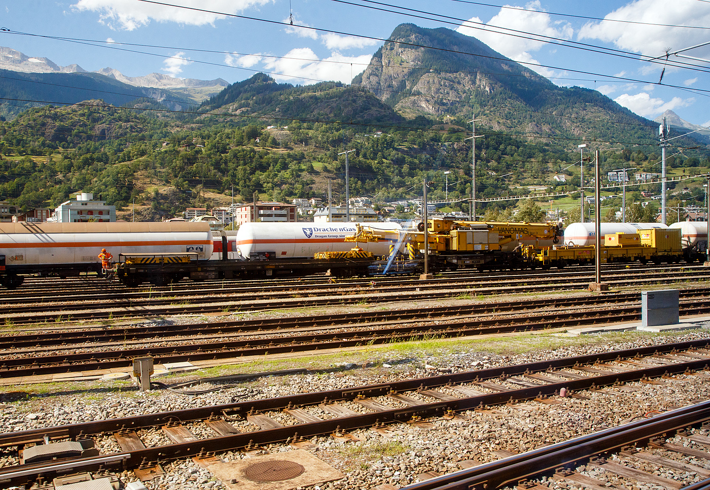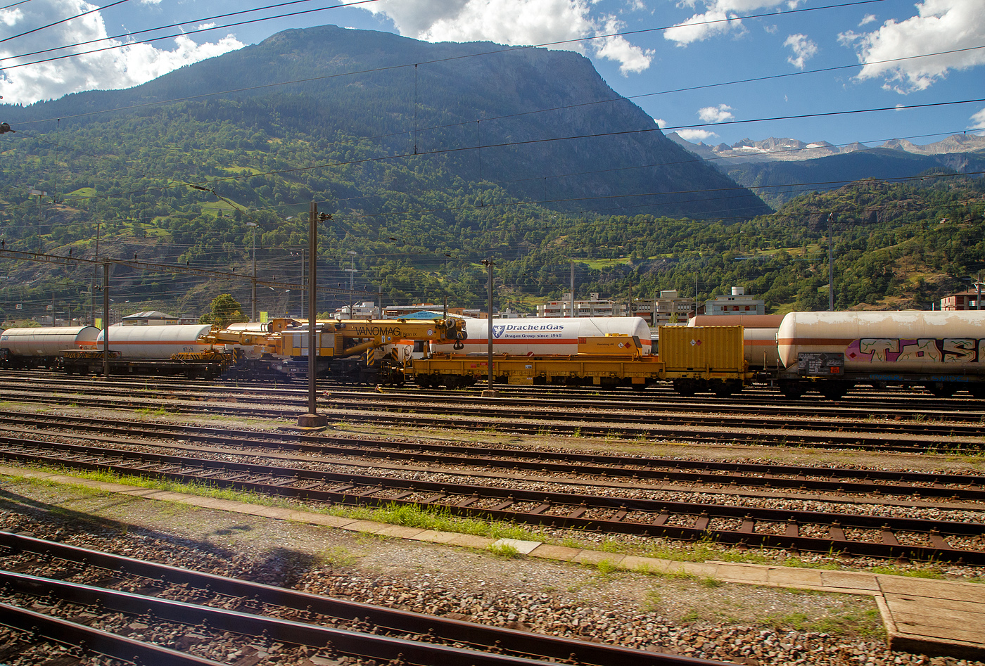 Die SBB Aem 940 025 (Aem 91 85 4 940 025-0 CH-SBB I) wartet mit dem mächtigen Rhomberg Sersa KRC 1200 Kranwagen (CH RSRM99 85 9219 102-2) und zwei Begleitwagen (33 85 4505 172-8 TEN-CH WASCO Sgmmns und 33 85 4505 173-6 TEN CH-WASCO Sgmmns) in Lausanne auf die Weiterfahrt.