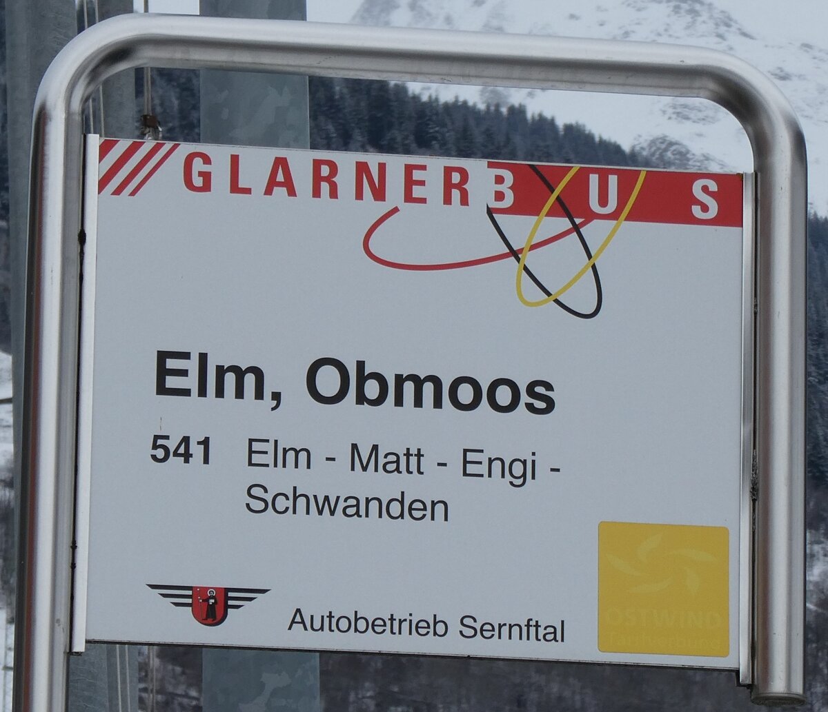 (284'450) - GLARNER BUS/Autobetrieb Sernftal-Haltestellenschild - Elm, Obmoos - am 30. Januar 2026