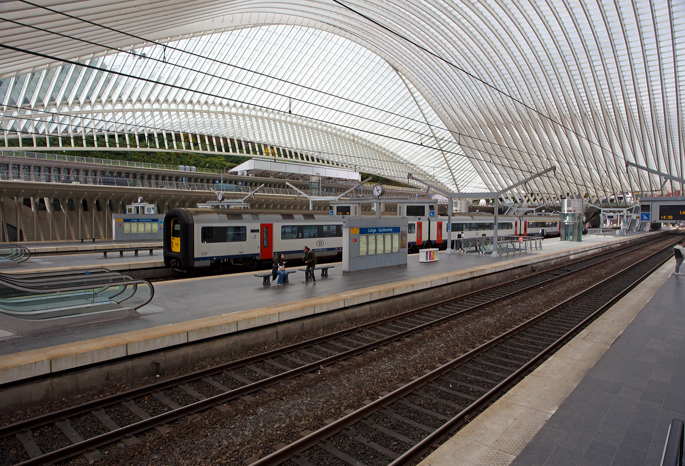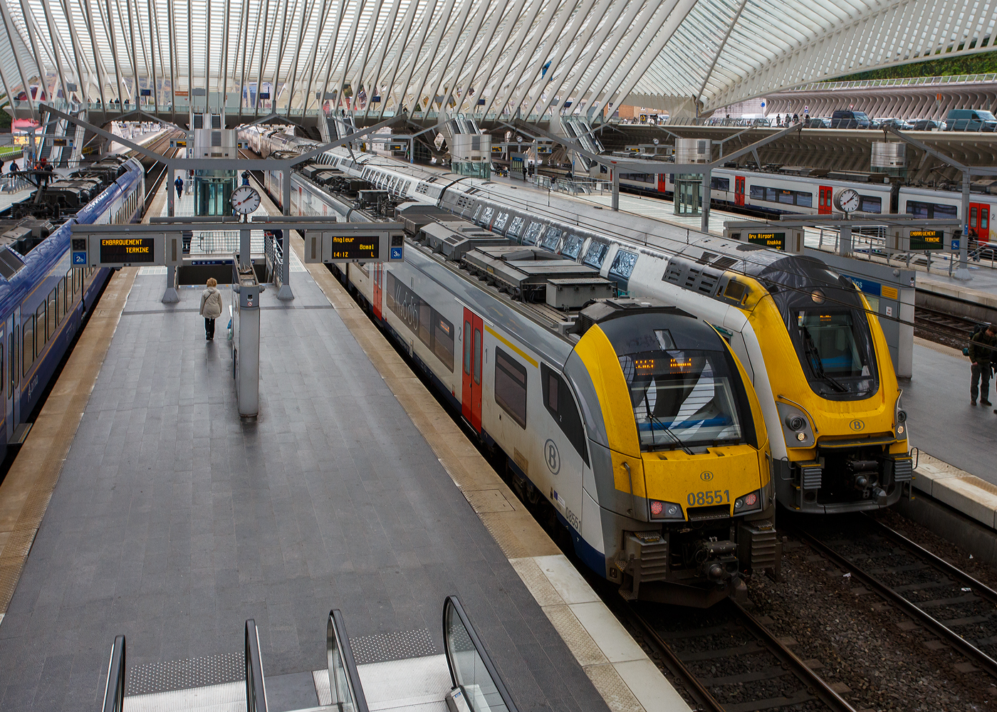 Zwei Triebzüge am 21 Oktober 2025 im Bahnhof Liège-Guillemins (Lüttich-Guillemins) nebeneinander. Vorne der Siemens Desiro ML SNCB/NMBS Triebzug AM 08551 (AM = Automotrice), als L-train (Lokalzug/Regionalzug) über Angleur (Stadtteil von Lüttich) nach Bomal. Dahinter ein langen M7 TWINDEXX-Triebwagen-Zug, als IC über Brüssel Flughafen, Gent und Brügge, an die Küste nach Knokke. Armin Schwarz