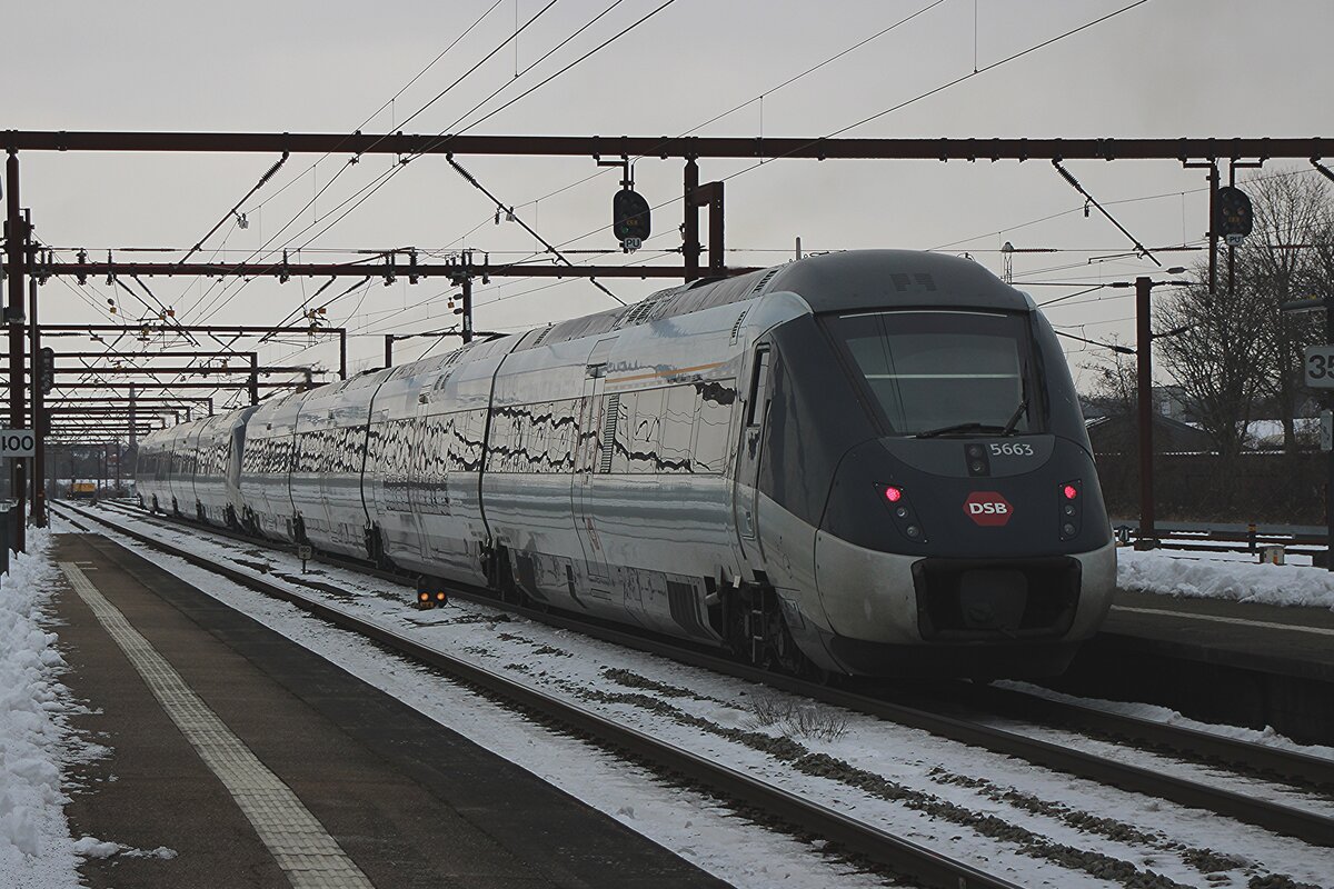 DSB 5663 verlasst Odense als RB nach Fredericia am Nachmittag von 16 Februari 2026. Die 83 Triebzüge hätten vor etwa 20 Jahre der ganze Dänischen IC-Verkehr modernisieren sollen, sind jedoch der grossthe Flopp der DSB je geworden und einige sind schon verschrottet, andere nach Rumänien verkauft worden und die restlige Züge werden in Regionaldiernste eingesetzt.