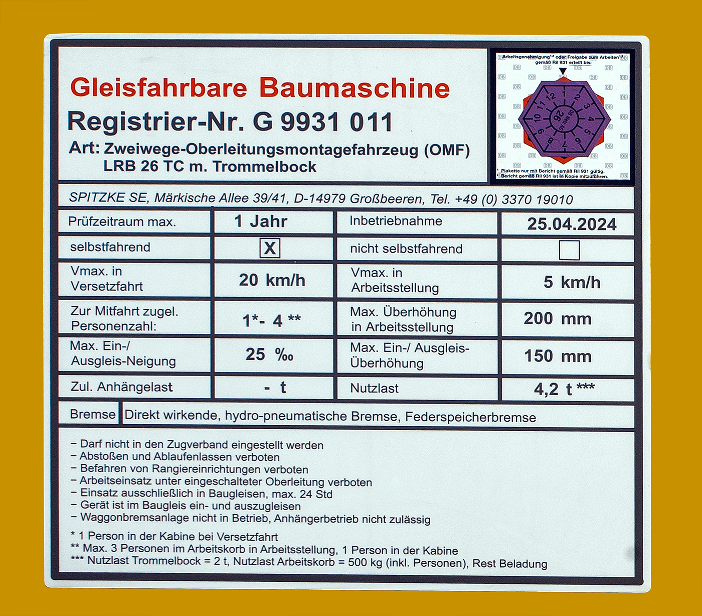 Anschriftentafel von dem Gleiskraftwagenanhänger GKW-A, Kleinwagen D-SESAF 99 80 9750 437-2 der SES Aus- und Fortbildung e.K. (Horst), abgestellt am 01.04.2023 beim Hp Grünebach Ort (an der Hellertalbahn).