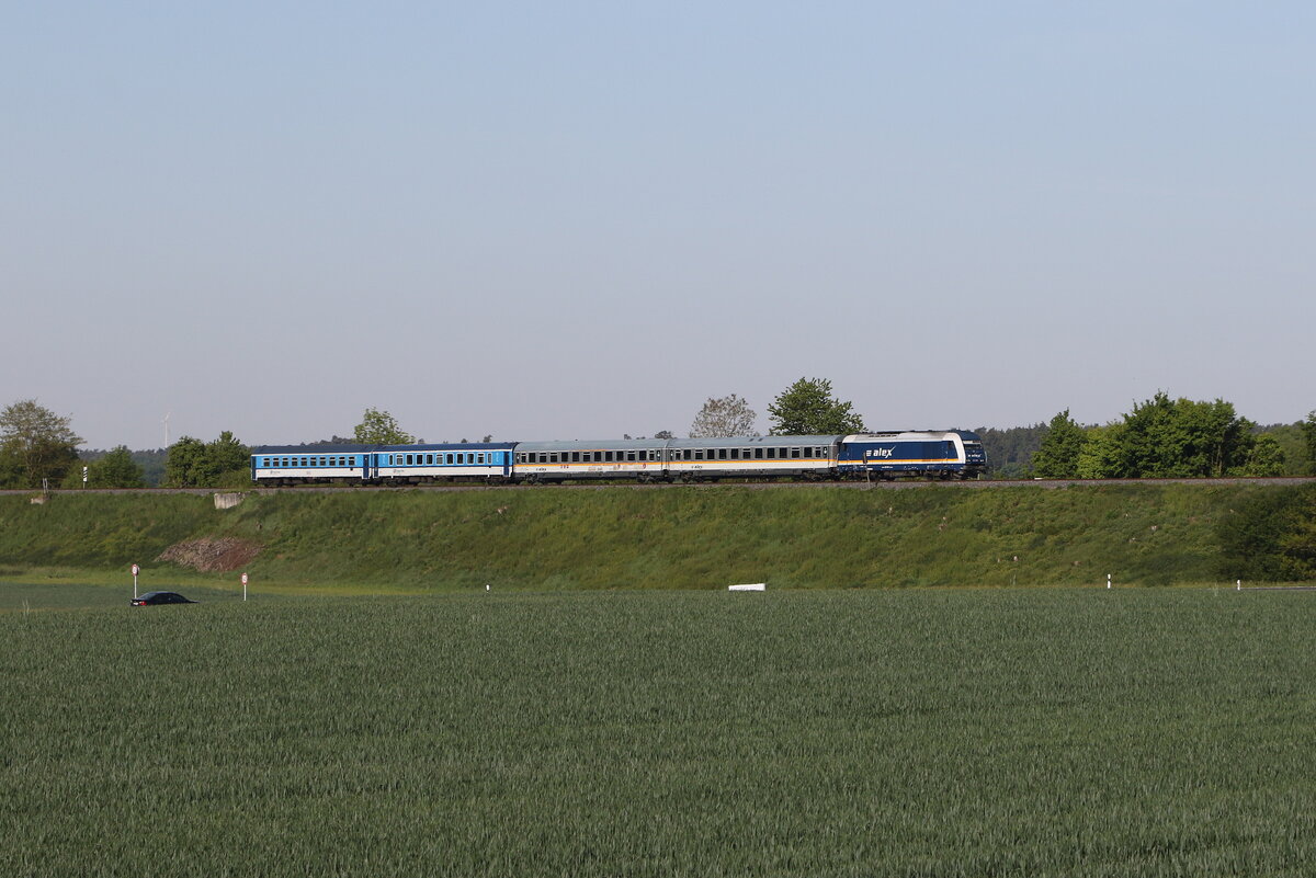 223 063 war am 14. Mai 2025 mit dem "ALEX" bei Zeitlarn in Richtung Hof unterwegs.