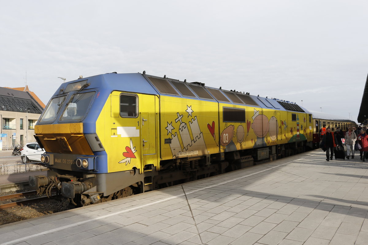 MAK DE 2700-02 mit einem Autozug am 14. August 2017 auf dem Hindenburgdamm.