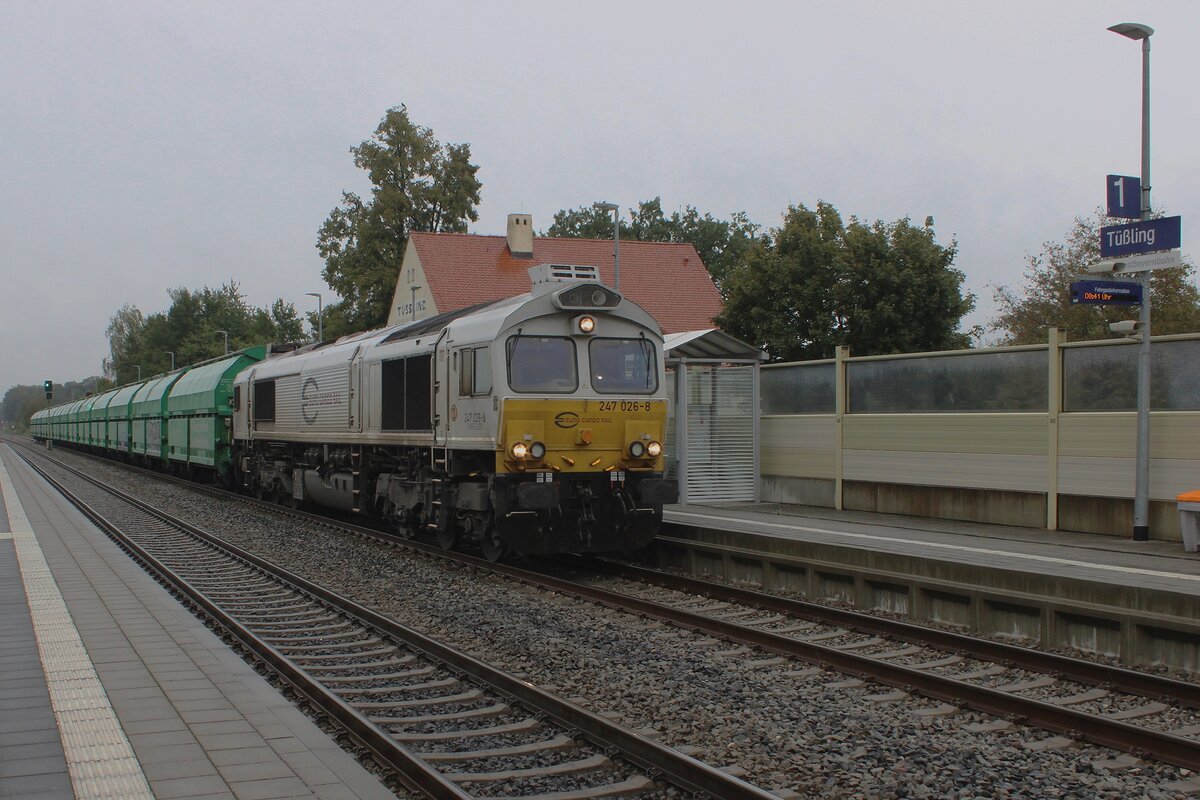 Am trüben 13 September 2024 treft ex-ECR 247 026 mit ein Kohlezug ins Bahnhof von Tüssling ein -der Fotograf hat dann noch keine Ahnung wie gravierend die Sturmschaden von BORIS werden sollen.