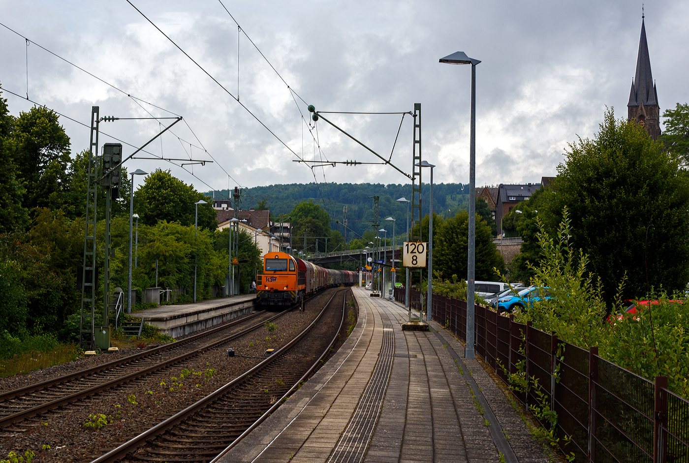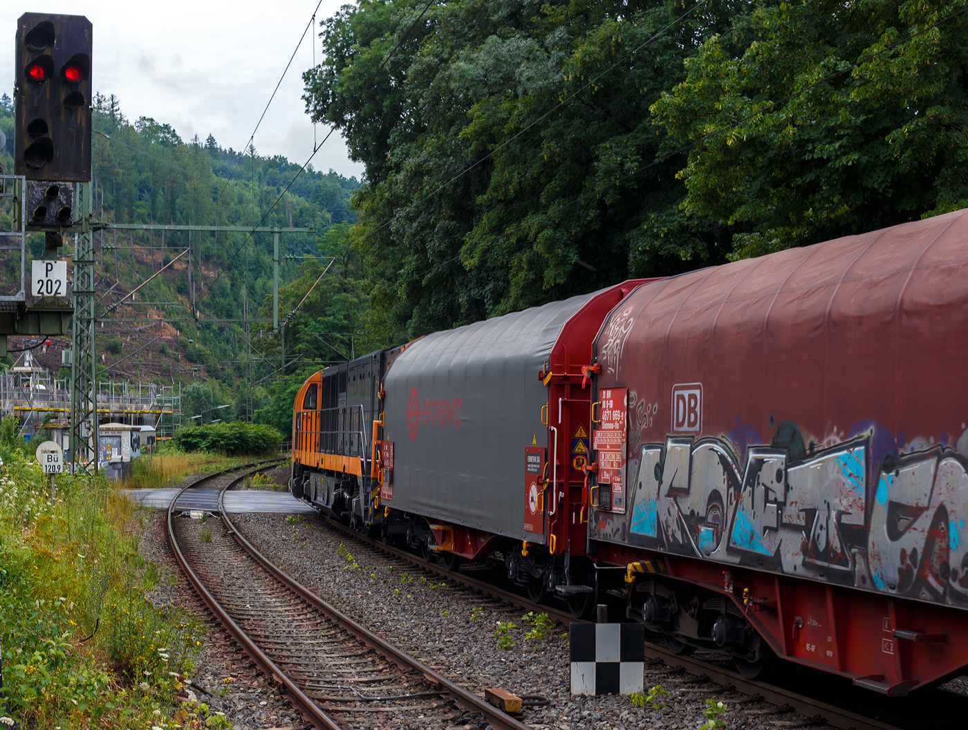 Die KSW 43 (92 80 1273 018-2 D-KSW), die asymmetrische Vossloh G 2000 BB der KSW (Kreisbahn Siegen-Wittgenstein) fährt am 07 Juli 2025, mit einem beladen Coilzug, durch den Bahnhof Kirchen (Sieg) in Richtung Betzdorf. In Betzdorf (Sieg) muss sie dann umsetzen und es geht dann über KBS 462 „Hellertalbahn“ nach Herdorf zum Rbf der KSW (Betriebsstätte FGE -Freien Grunder Eisenbahn). Für die Weiterfahrt auf den Pfannenberg (in Neunkirchen-Salchendorf) übernimmt dort meist dann eine andere Lok den Zug.
