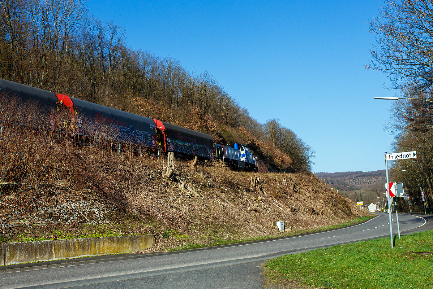 Geführt von der KSW 42 (92 80 1277 902-3 D-KSW), eine Vossloh MaK G 1700 BB, fährt am 19 März 2025 die KSW (Kreisbahn Siegen-Wittgenstein), im Sandwich mit einem schweren Coilzug, von Betzdorf/Sieg in Richtung Herdorf zum KSW-Rangierbahnhof (Betriebsstätte FGE - Freien Grunder Eisenbahn), hier bei Herdorf-Sassenroth. Am Zugschluss die nachschiebende KSW 45 (98 80 0276 016-9 D-KSW) eine MaK G 1204 BB. Armin Schwarz