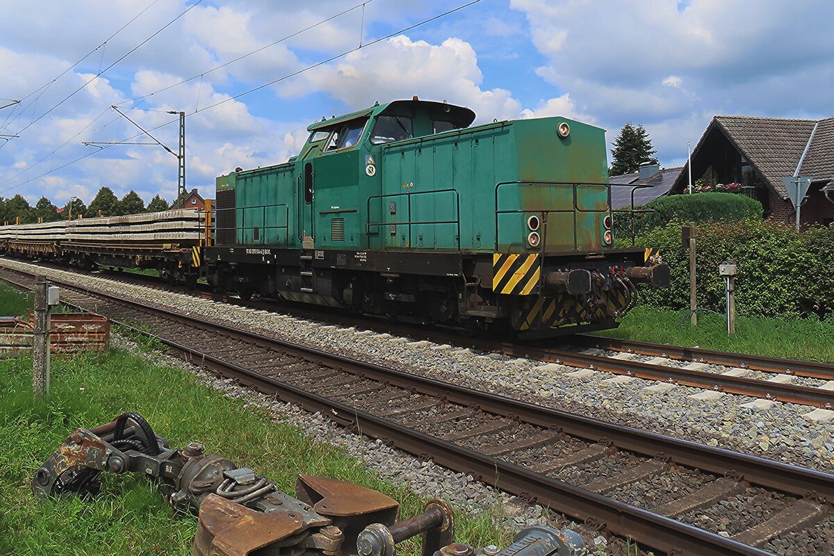 V 150.03, ex DR 110 961-0, ex DB 710 961-4, der SGL Schienen-Güter-Logistik GmbH ist am 02.08.2014 mit einem Bauzug (Materialförder- und Siloeinheiten) beim Bahnhof Siershahn (Westerwald) abgestellt.