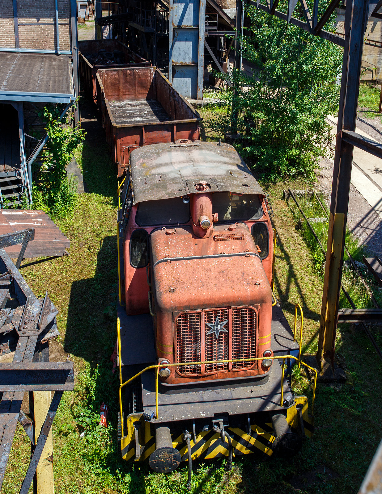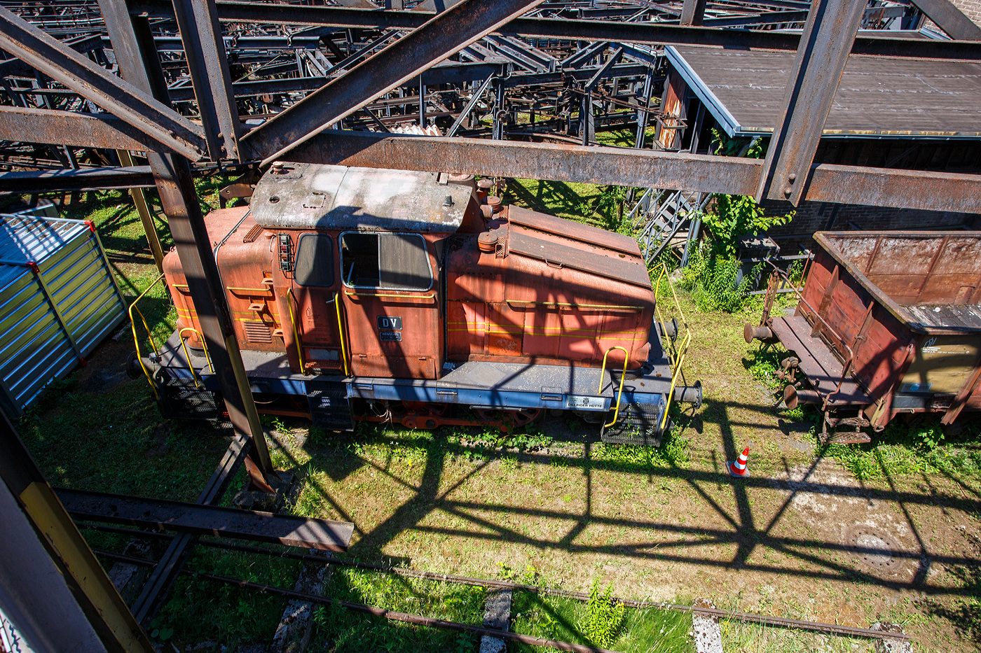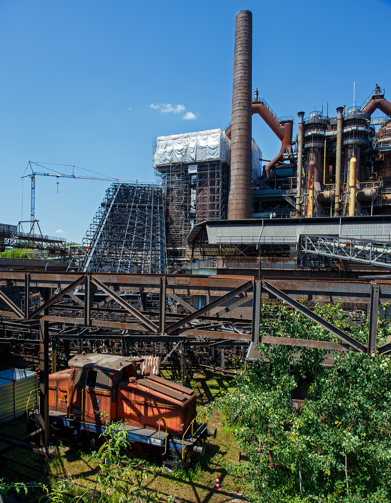 Die Dieselhydraulische Normalspur-Lokomotive Nr. 34, eine Henschel DHG 240 B "Esslinger", der Völklinger Hütte (ehem. Röchling'schen Eisen- und Stahlwerke GmbH in Völklingen/Saar, ab 1982 ARBED-Saarstahl GmbH, ab 1986 Saarstahl Völklingen GmbH) hier am 01 Juli 2025 abgestellt als Denkmal, mit zwei selbstentladende Schüttgutwagen der Gattung Fad oder Falns am Eingang der Rohstoffentladebunker in Richtung Hüttenbahnhof. Die Darstellung steht für den Rohstofftransport der Hütte zur Herstellung des Sintergutes. Die Lok war auch auf Bundesbahn Gleisen zugelassen. Heutiger Eigentümer der Lok und Wagen ist die Initiative Völklinger Hütte e.V..