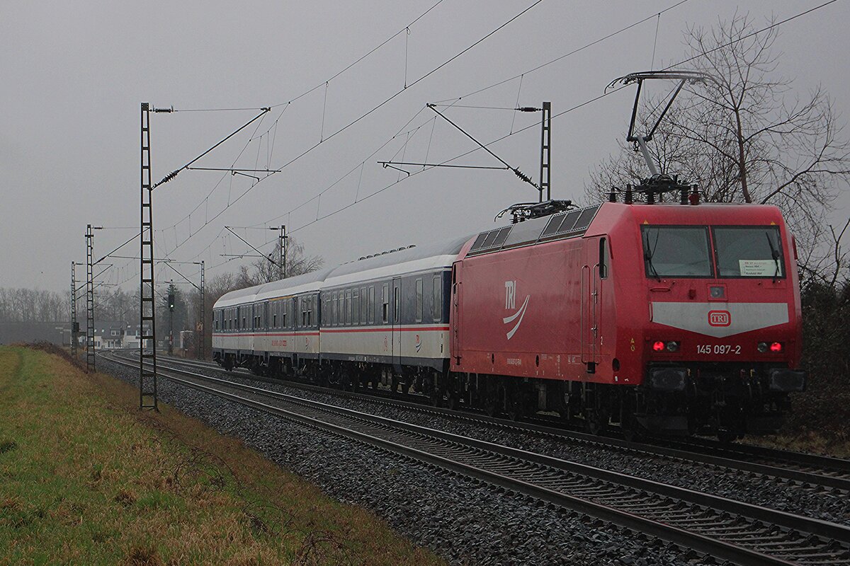 Am verregneten 12 Februar 2026 schiebt TRI 145 097 der RB 37 nach Krefeld Hbf durch Kaarst-Broicherseite und wird vom offenbarer Weg fotografiert. Dieser Himbeerroter Farbgebung ist eine kleiner Witz von TRI; die DB 145er haben diese Farben nie getragen. Leon Schrijvers