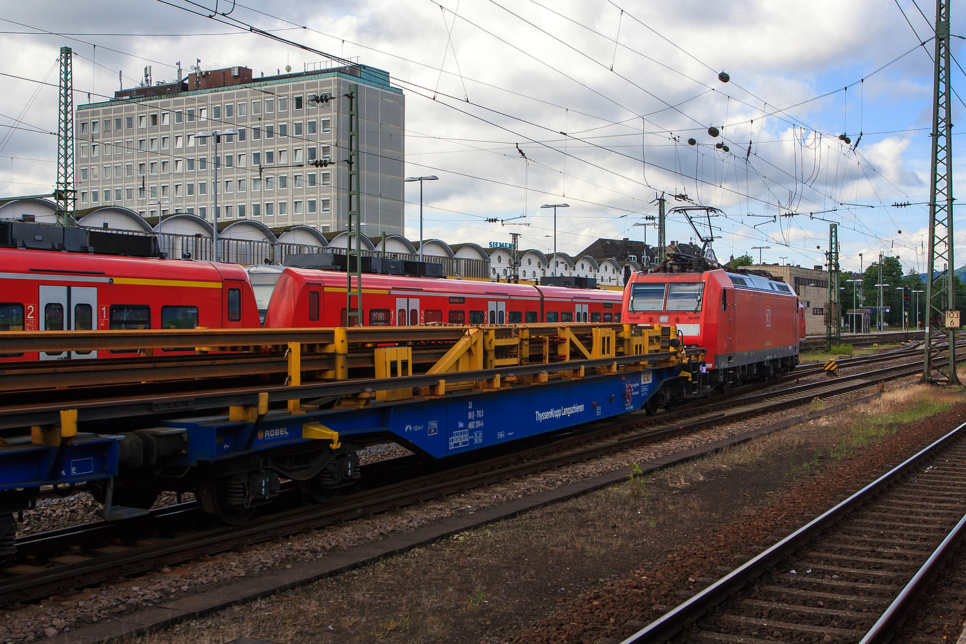 185 159-1 zieht die kalte 189 020-1 und einen gemischten Güterzug am 13.07.2013 hier zwischen Katzenfurt und Sinn in Richtung Siegen.