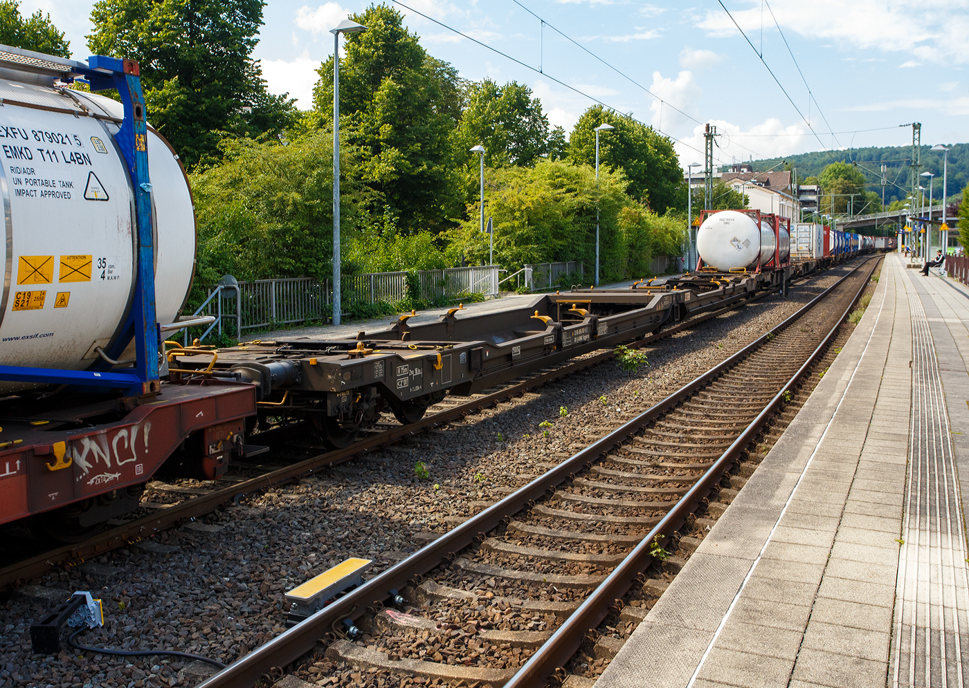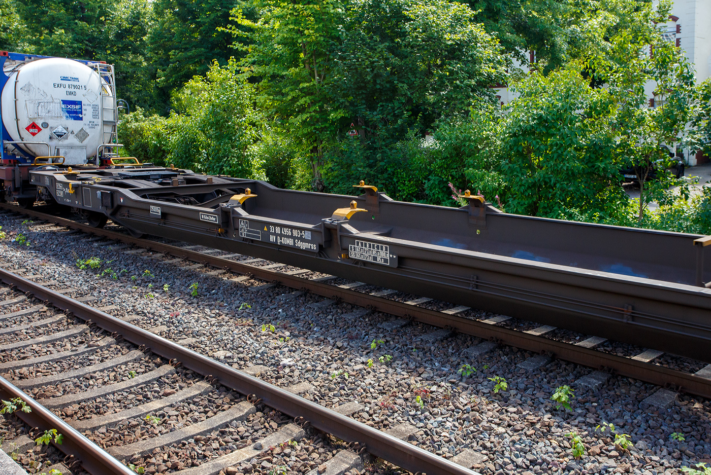 Leerer vierachsiger Drehgestell-Containertragwagen 31 80 4578 206-2 D-KOMBI, der Gattung Sgmnss, der Kombiverkehr GmbH & Co KG (Frankfurt am Main), am 30 Juli 2025 im Zugverband bei der Zugdurchfahrt in Kirchen/Sieg.