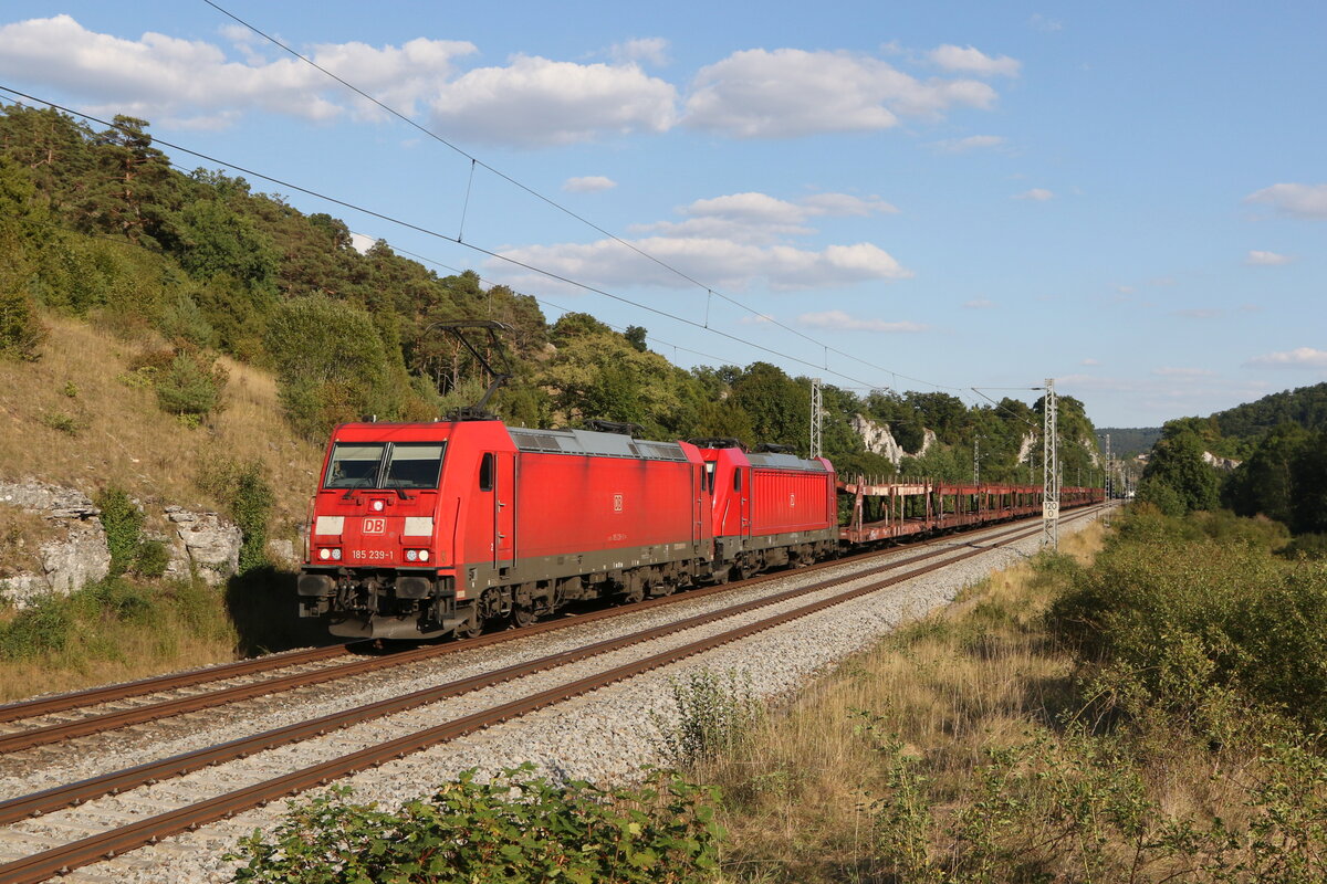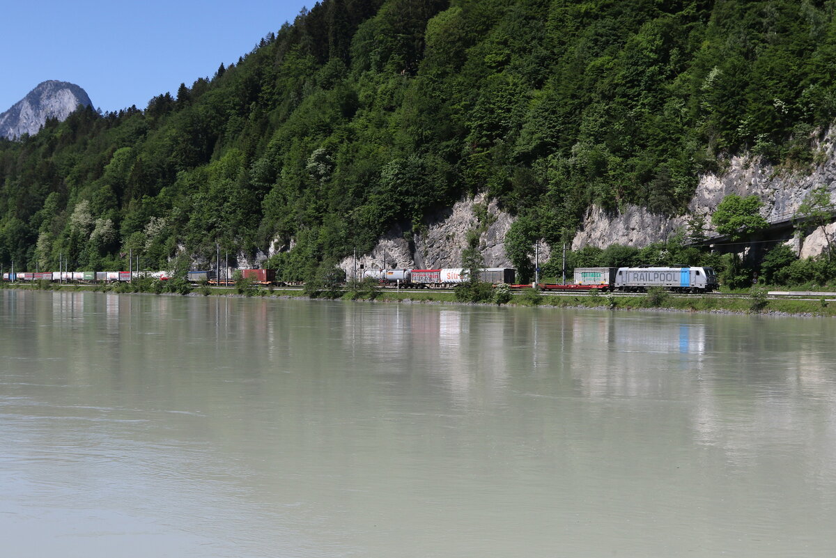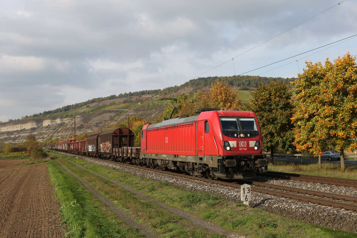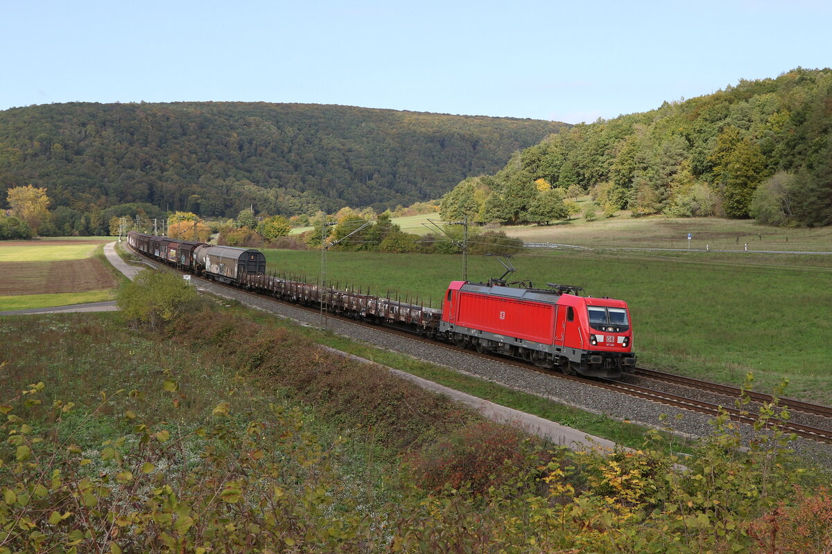 187 157 mit einem Containerzug am 27. August 2019 bei Hermannspiegel im Haunetal in Hessen.