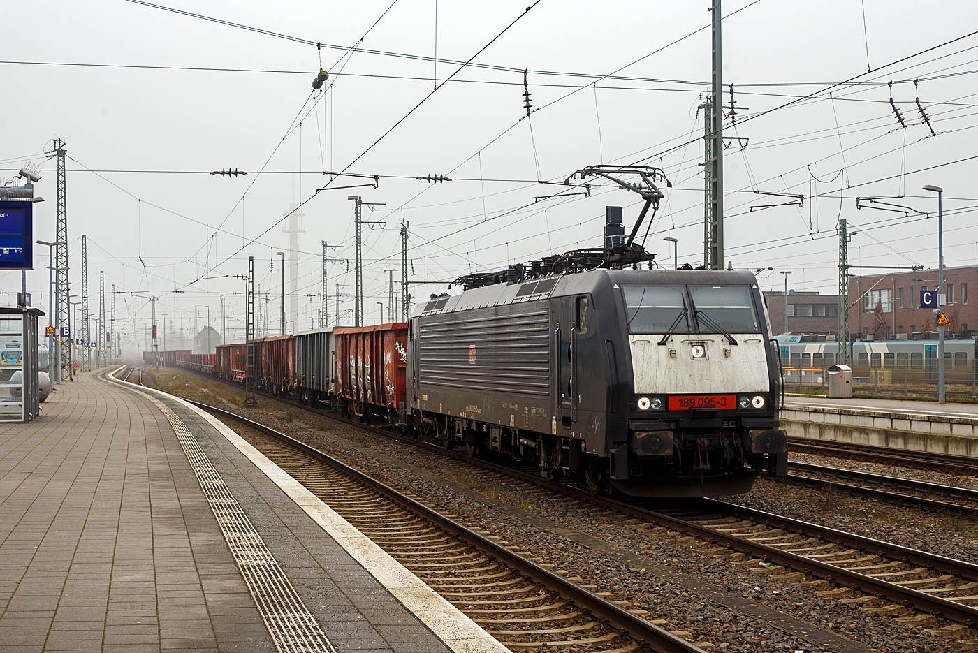 Die schwarze DB 189 095-3 (91 80 6189 095-3 D-DB) der DB Cargo AG, ex MRCE Dispolok E 189-095-3 / ES 64 F4-995, am 21 Januar 2025 mit einem gemischten Güterzug im Bahnhof Rheine. Länger hatte sie Hp 0 nun endlich hat sie Hp 1 und fährt Richtung Norden los. Die Siemens EuroSprinter ES 64 F4 wurde 2003 in der Variante B2 (Class 189-VB2) von Siemens in München-Allach unter der Fabriknummer 21081 gebaut und an die Railion Deutschland AG ausgeliefert. In der Variante B hatte sie nur die Zulassung für Deutschland. Im Oktober 2006 wurde sie an die MRCE - Mitsui Rail Capital Europe B.V. verkauft (ab 2008 MRCE Dispolok GmbH, München). Im Januar 2008 wurde sie in die Variante J (Class 189-VJ) umgebaut und besitzt so die Zugbeeinflussungssysteme LZB/PZB, ETCS und ATB für den Einsatz in Deutschland und die Niederlande. Die Stromabnehmerbestückung ist folgende: Pos. 1: D, NL (AC) Pos. 2: NL (DC) Pos. 3: NL (DC) Pos. 4: D, NL (AC) Nach vielen Mietstationen u.a. auch DB Cargo, wurde sie im Juni 2021 wieder von der DB Cargo AG gekauft.