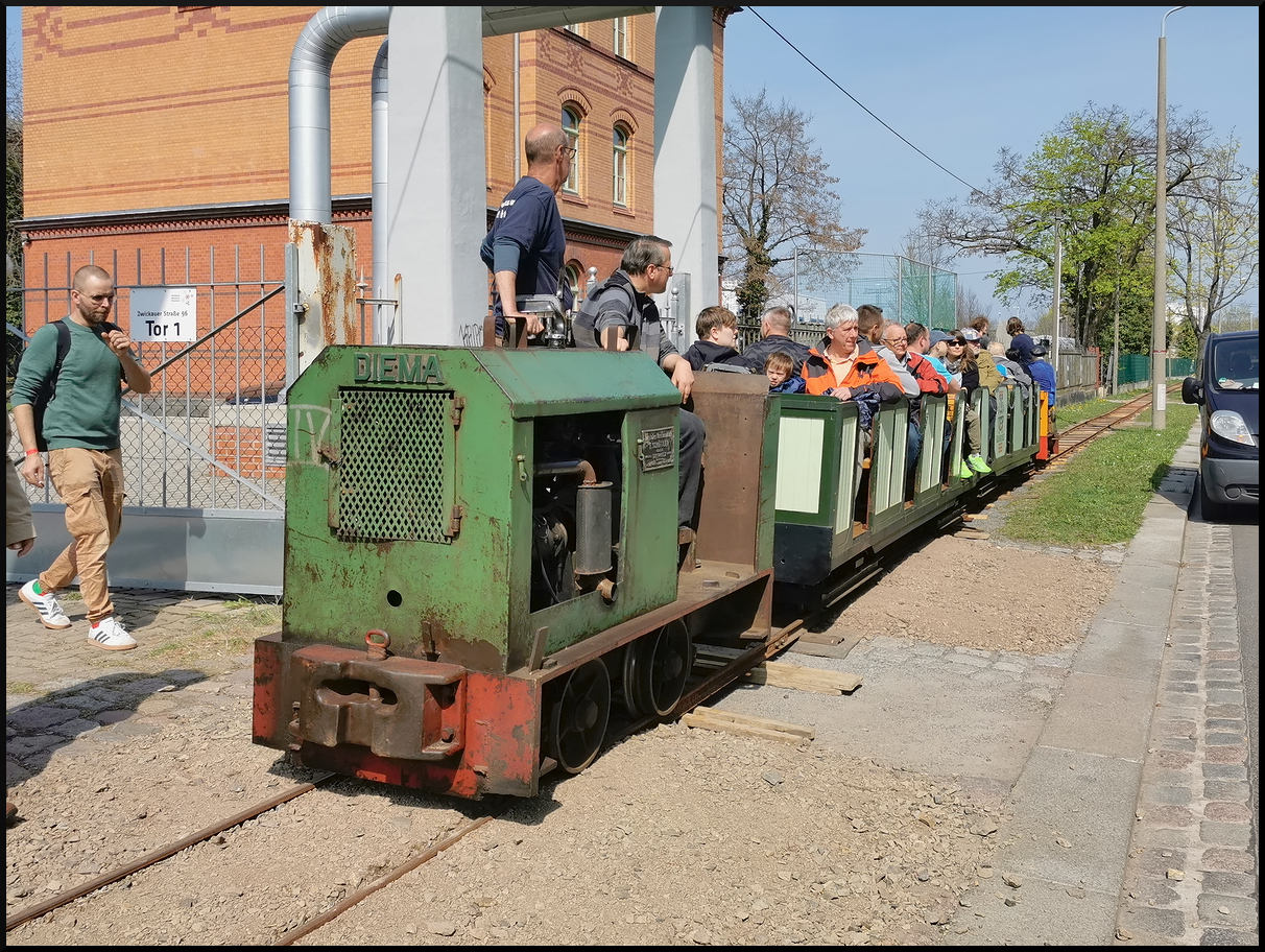 Das Feldbahnmuseum Herrenleite kam mit seiner mobilden Anlage zum 17. Dresdner Dampfloktreffen. Neben den Personenwagen waren an den Zugenden eine Feldbahnlok als Zuglok im Einsatz. Damit die Loks nicht entgleisten musste eine Mitarbeiterin der Feldbahn als "Gewicht" auf der Lok mitfahren. Für 1,-- EUR konnte man so zwischen den vorderen und Museumseingang mitfahren. Am 12.04.2025 wurde eine der Pendelfahrten vom vorderen Eingang zum Eingang des Eisenbahnmuseum an der Zwickauer Str Höhe Haus 4 fotografiert.