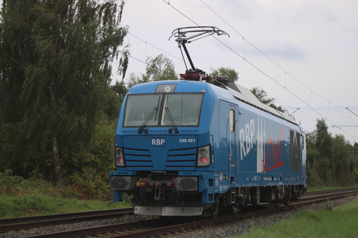 Die an die ERC.D GmbH (European Railway Company Deutschland, Nürnberg) vermietete SIEMENS Vectron Dual Mode 248 039-0 (90 80 2248 039-0 D-ATLU) der Alpha Trains Luxembourg s.à.r.l. fährt am 23 August 2025, mit der an die WRS Deutschland GmbH vermietete 151 033-3 (91 80 6151 033-8 D-SRI) der SRI Rail Invest GmbH im Schlepp, durch Scheuerfeld/Sieg in Richtung Köln. Die SIEMENS Vectron DM 248 039 wurde 2023 von Siemens Mobility GmbH in München-Allach unter der Fabriknummer 23261 gebaut. Die ex DB 151 033-8 wurde 1974 von Krauss-Maffei AG in München-Allach unter der Fabriknummer 19652 gebaut.