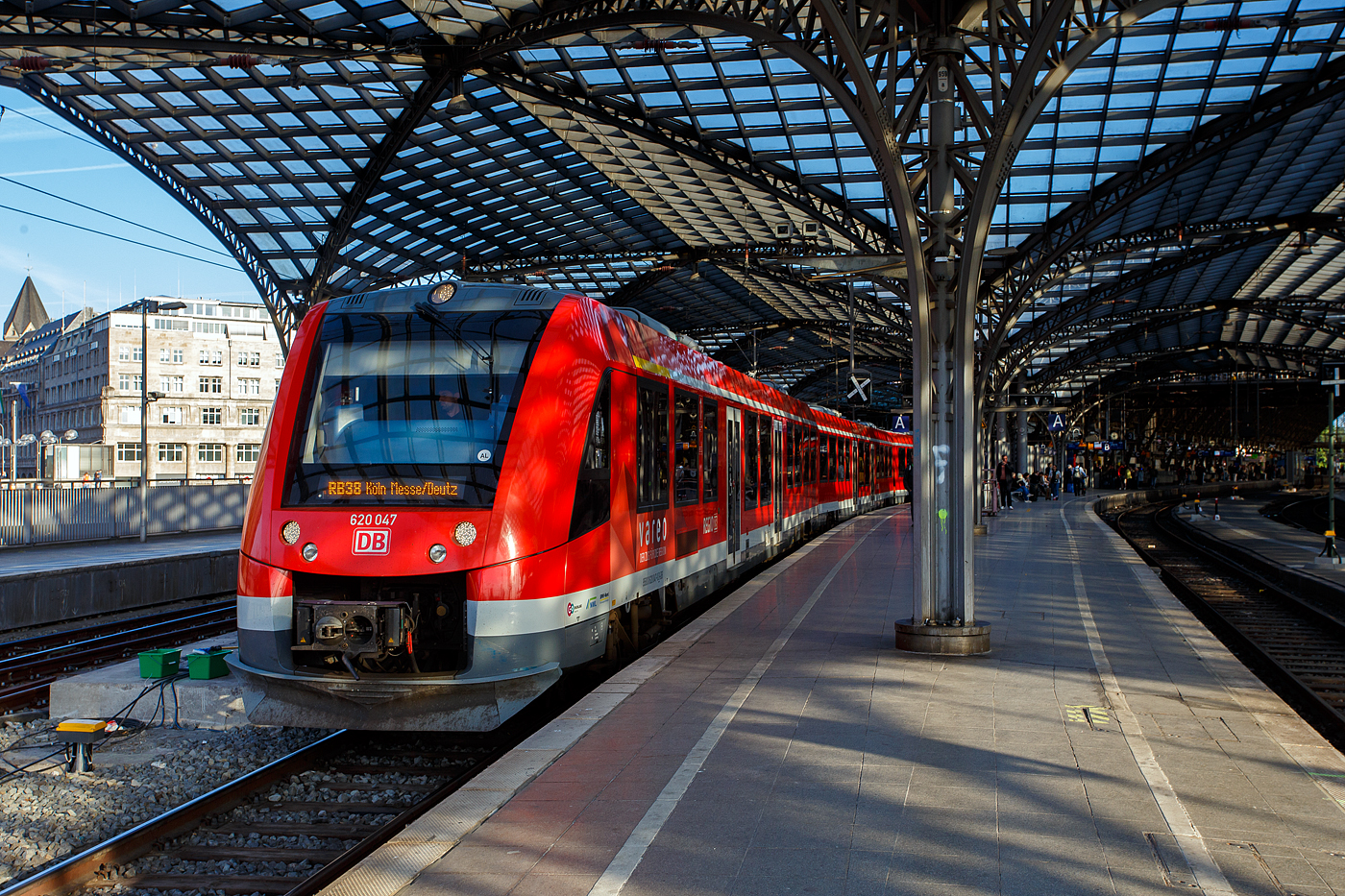 Der dreiteilige Dieseltriebzug ALSTOM Coradia LINT 81 – 620 518 / 621 018 / 620 018 der DB Regio NRW – vareo, verlässt am 29 April 2025, als RB 38 „Erft-Bahn“ (Köln Messe/Deutz - Köln Hbf - Horrem - Bergheim - Bedburg/Erft), den Hauptbahnhof Köln und fährt weiter in Richtung Horrem.