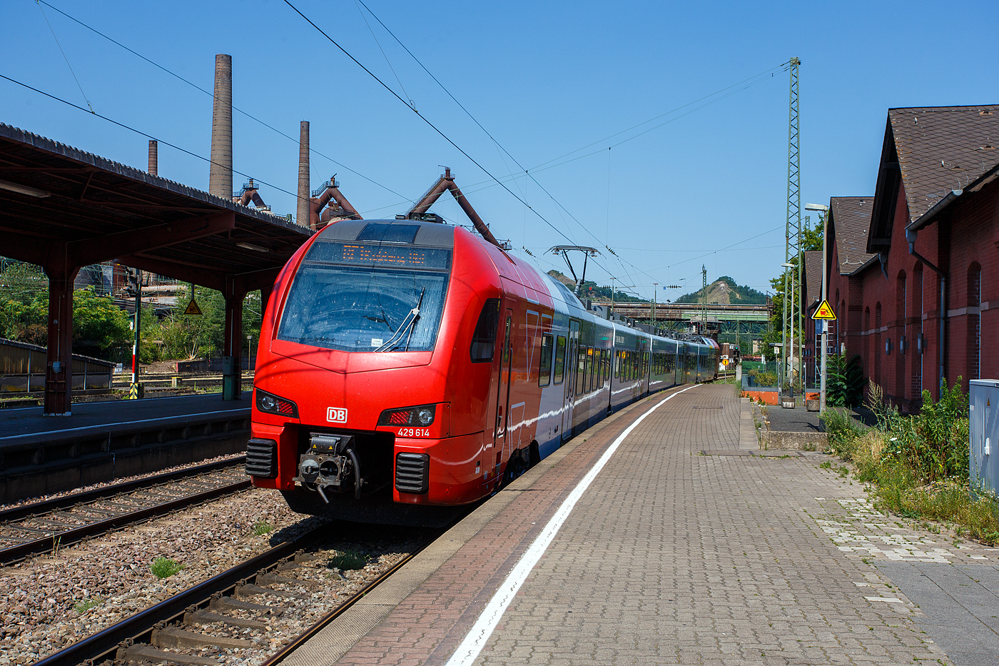 Der fünfteilige SÜWEX Stadler FLIRT 3 – 429 114 / 429 614, als RE 1 "Südwest-Express" (Kaiserslautern – Trier – Koblenz), verlässt am 01 Juli 2025 den Bahnhof Völklingen und fährt weiter in Richtung Dillingen. Ich finde das neue Farbdesign der SÜWEX (Südwest-Express), mit den nun roten Triebwagenköpfen, ist für mich gelungener als das alte Farbdesign.