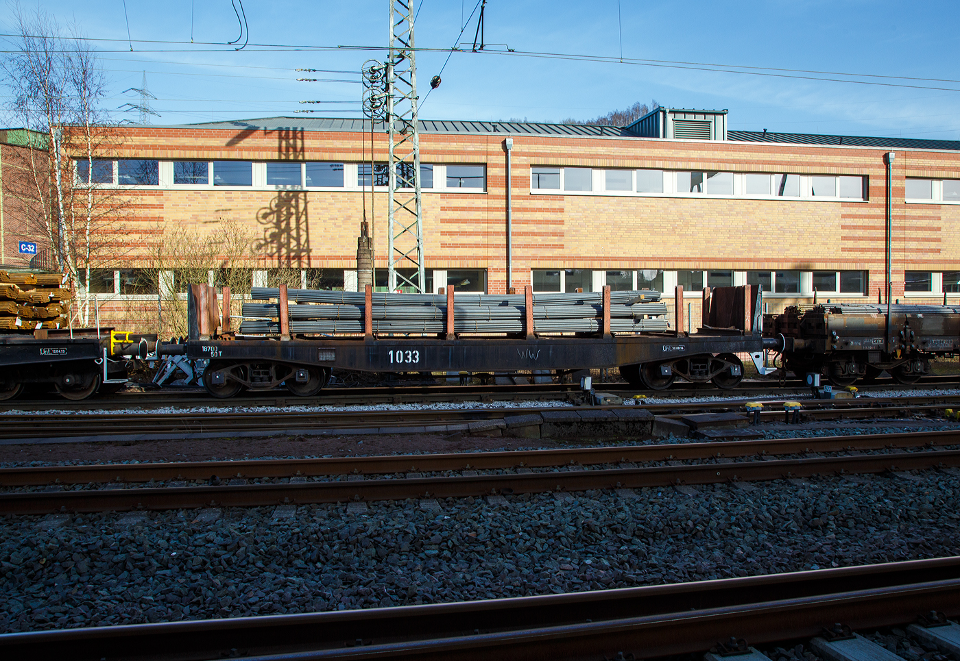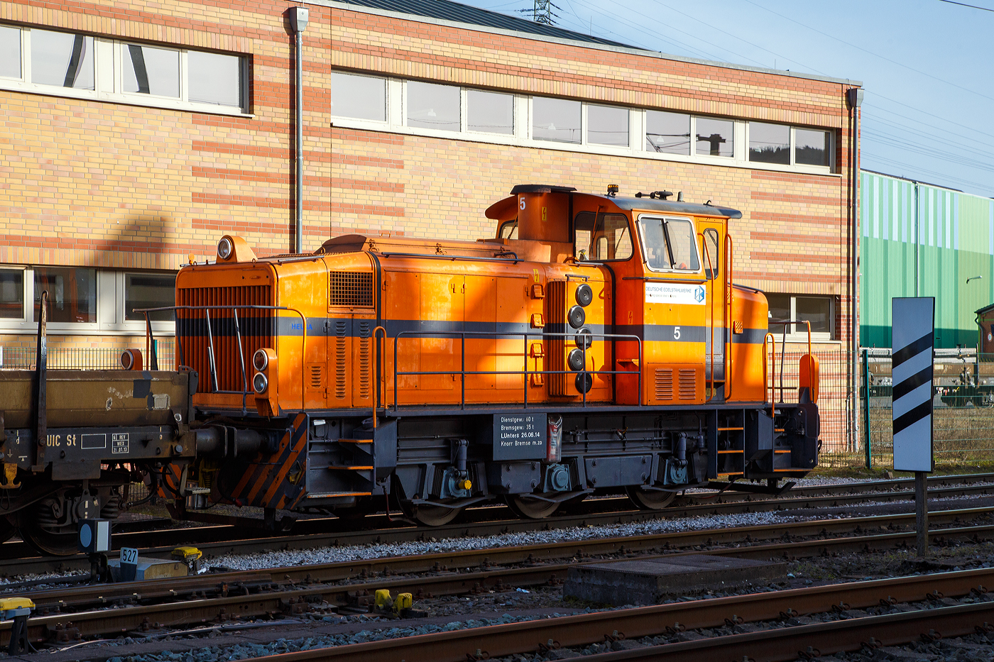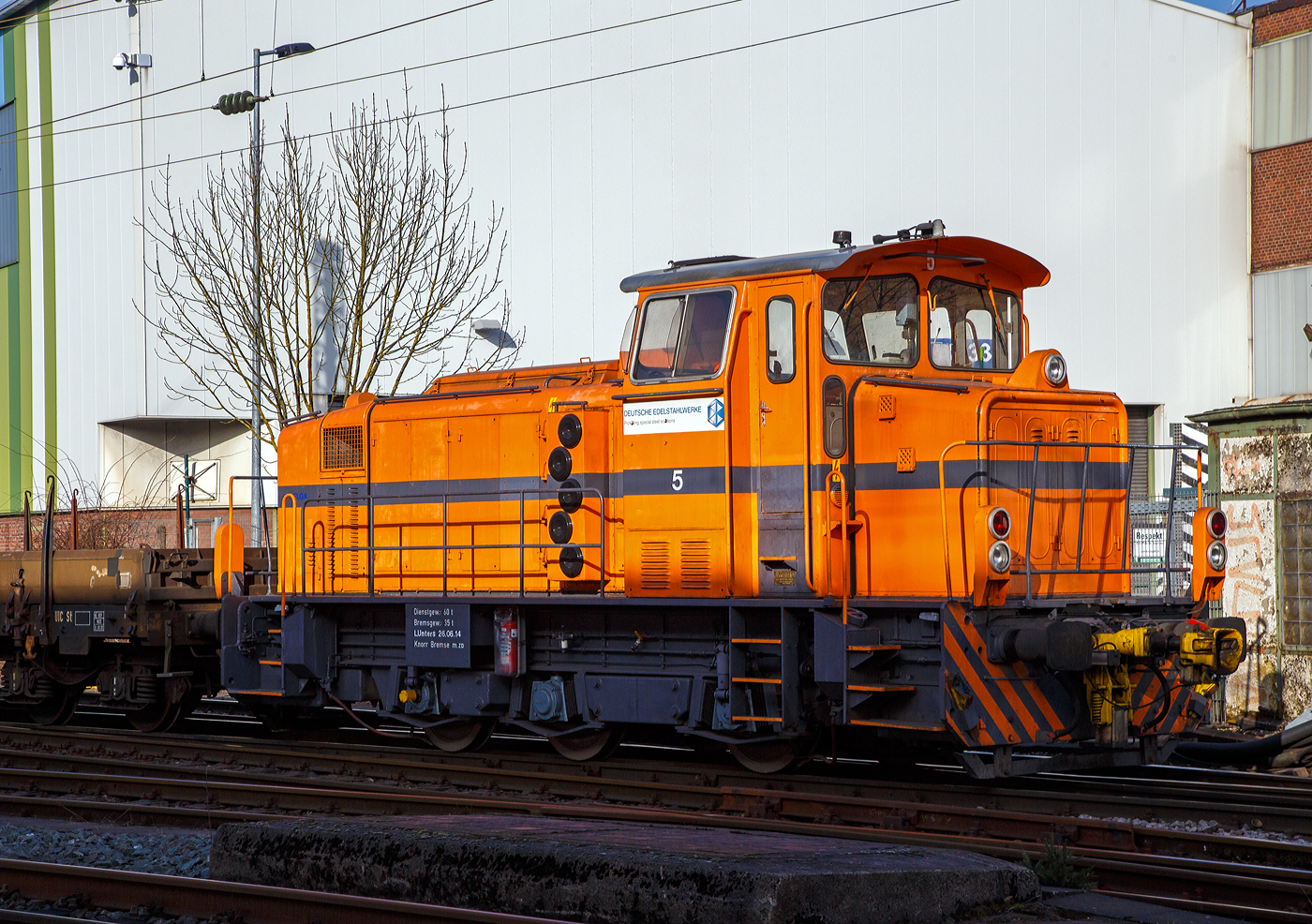 Links auf dem Gleis steht die KSW 44 (92 80 1271 004-4 D-KSW) eine MaK G 1000 BB der KSW (Kreisbahn Siegen-Wittgenstein), die in der anderen Richtung die Überholung des RE 34 abwarten muss (was ich nicht ganz verstehe). Im Hintergrund das Stahlwerk der Deutschen Edelstahlwerke GmbH, zuvor Edelstahlwerke Südwestfalen.