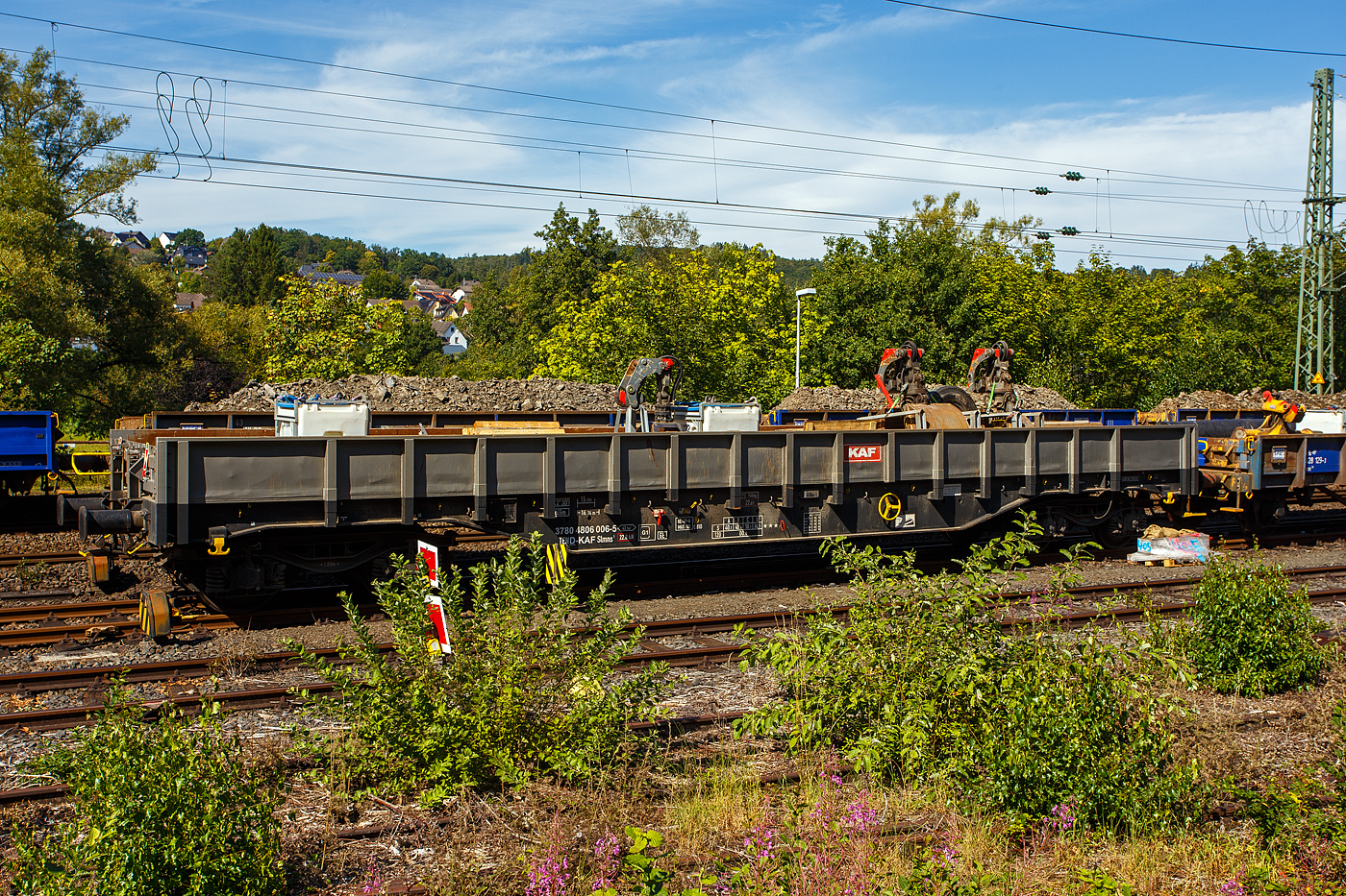 Sechsachsiger Drehgestell-Flachwagen (Schwerlastwagen), mit Rungen, jedoch ohne Stirn- und Seitenwandklappen, 33 80 482 7 016-3 D-RCW der Gattung Sammnps 482, eingestellt durch die Rail Cargo Group (zu ÖBB) in Deutschland, am 20.04.2018 im Zugverband bei der Durchfahrt im Bahnhof Bonn-Beuel, hier beladen mit U-Stahl (warmgewalzter Profilstahl in Herstellungslänge vom 12 m). Nach dem Aufkleber (MFI) zu urteilen, gehört der Wagen der MFI - Matériel Ferroviaire et Industriel S.A. und ist über die RCW eingestellt.