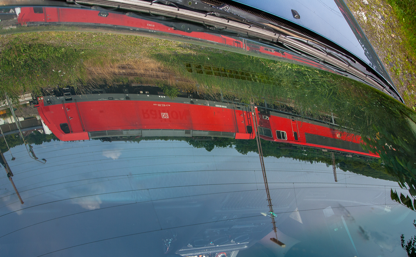 Eine kleine Spiegellei mit dem abgestellten ČD „RegioShark“ 844 024-0 (CZ-ČD 95 54 5 844 024-0), ein Dieseltriebzug vom Typ PESA LINK II (Pesa 223M), am 19.04.2023 im Bahnhof Karlovy Vary (Horním nádražím) / Karlsbad (Oberer Bahnhof).