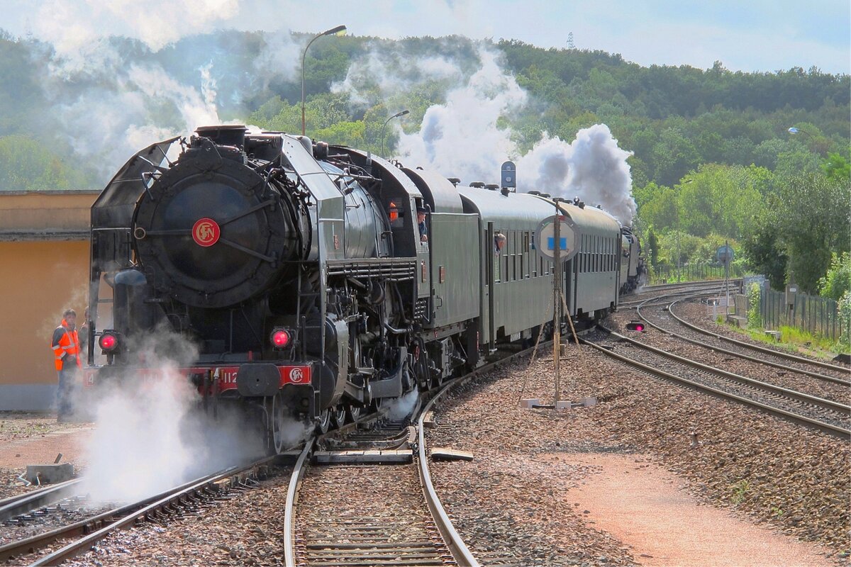 Nach einem kurzen Halt setzt sich die mächtige (ex) SNCF Dampflok 141 R 568 der "L'Association 141R568" mit ihrem Extrazug wieder in Bewegung. Das Ziel der Fahrt ist dieses Jahr Thun.