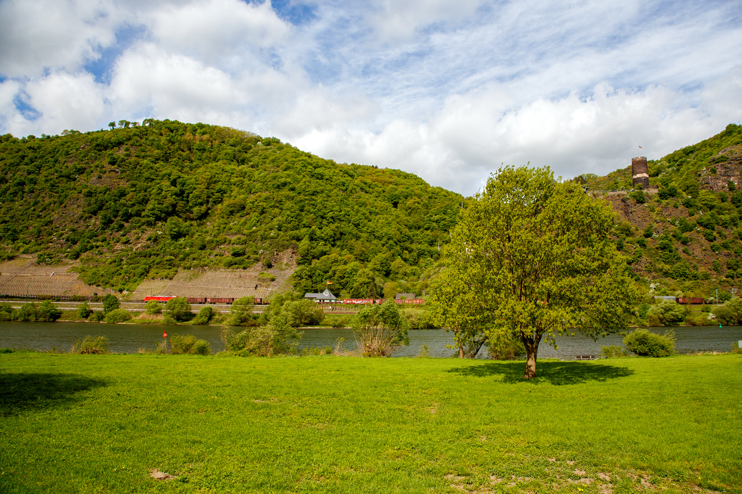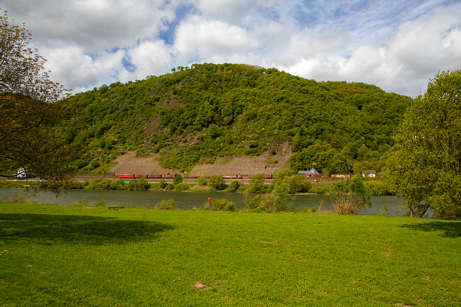 . Die Prima E 37518 (91 87 0037 518-4 F-ITL) zieht am 13.05.2015 einen Güterzug über den Hangviadukt in der Nähe von Pünderich. (Jeanny)