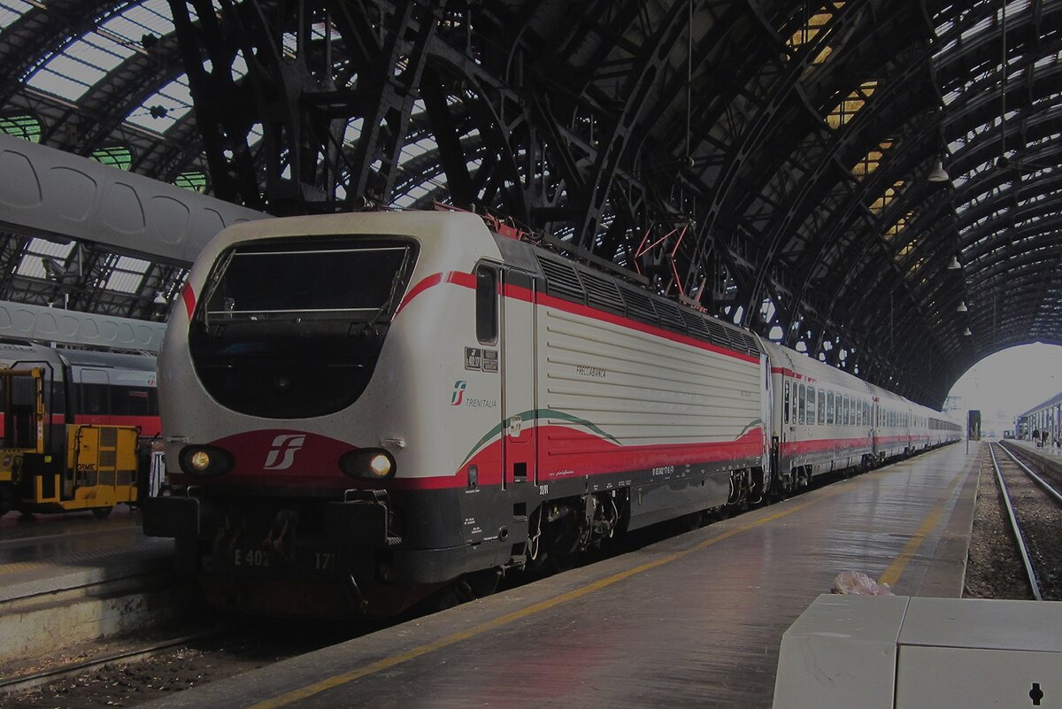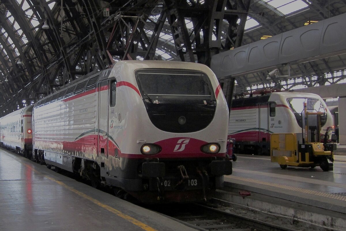 Die FS Trenitala E 402 120 und am Schluss des Zuges die 402 127 sind mit dem Treno di notte ICN 798 von Salerno nach Torino unterwegs. Der Zug erreicht den Bahnhof Rho Fiera Milano wo der ohne Halt durch fährt.
