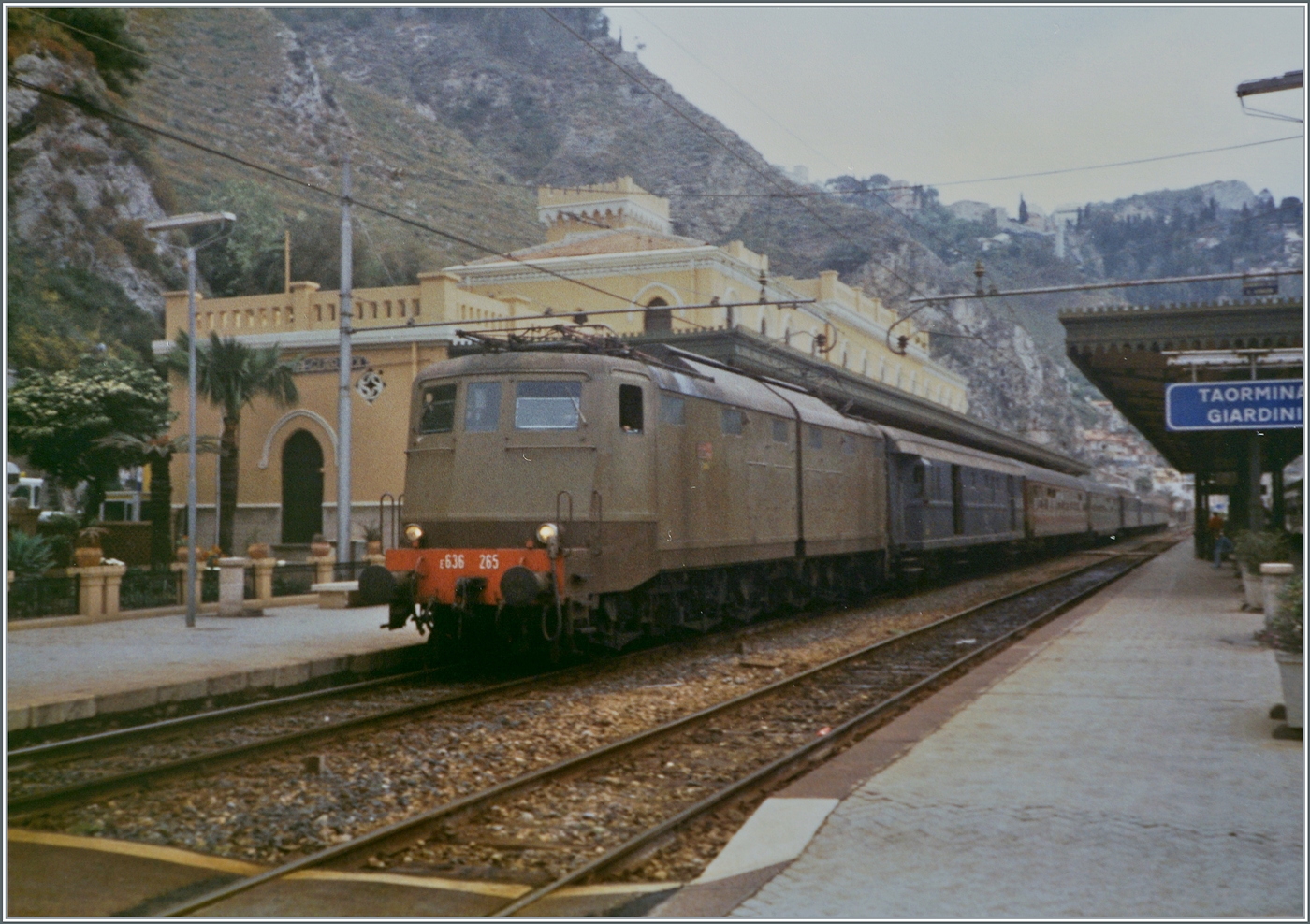Kurz nach dem Bahnhof von Taormina-Giardini ist diese FS 636 mit einem Güterzug auf dem Weg in Richtung Messina.