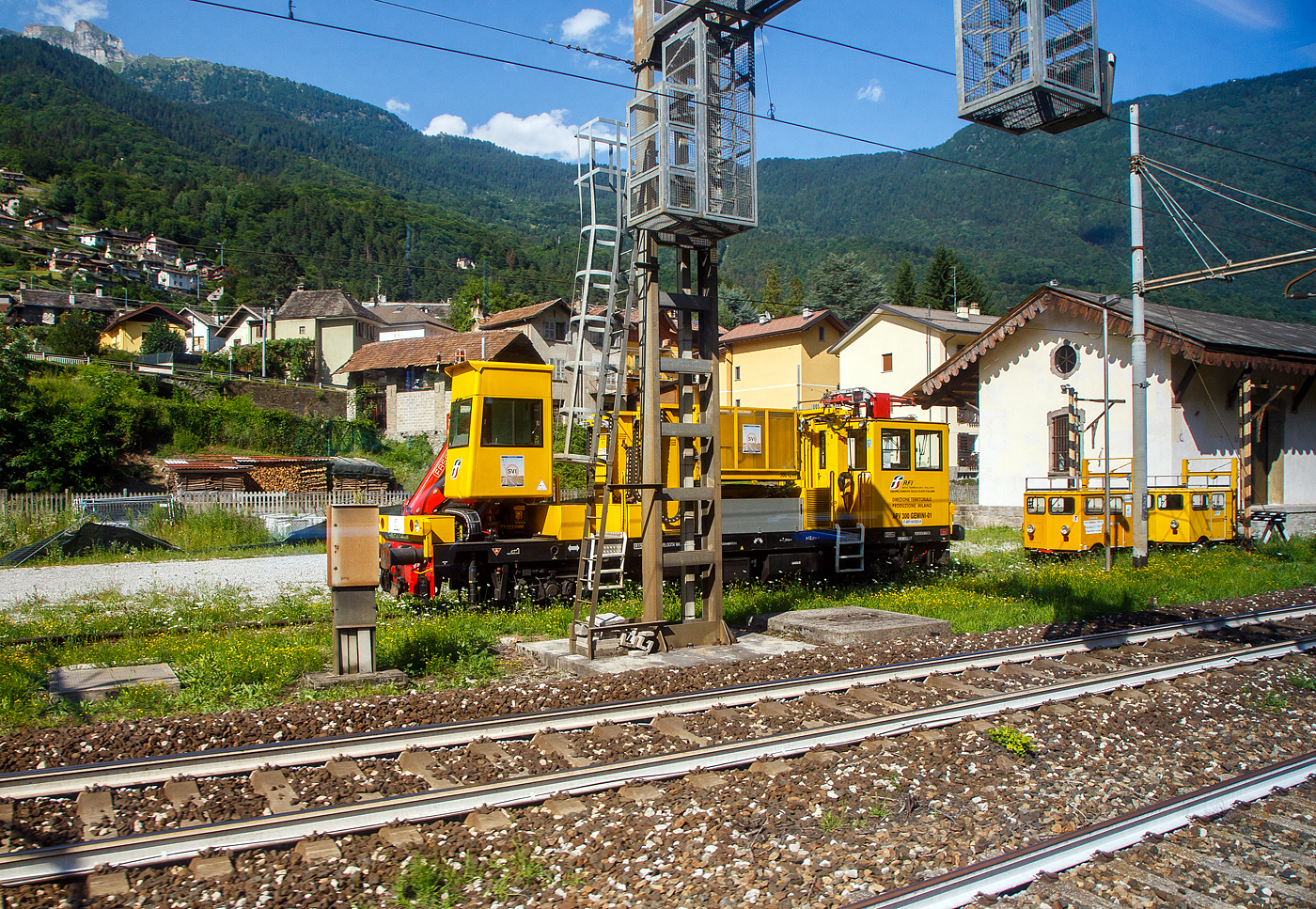 Mehrzweckfahrzeug OCPD 001, von Tesmec Rail, zur Wartung und Installieren von Oberleitungen mit Hilfe der an Bord installierten Spezialwerkzeuge, aufgenommen mit starkem Zoom, im Bahnhof von Verona Porta Nuova. (Starker Zoom) 09.05.2025