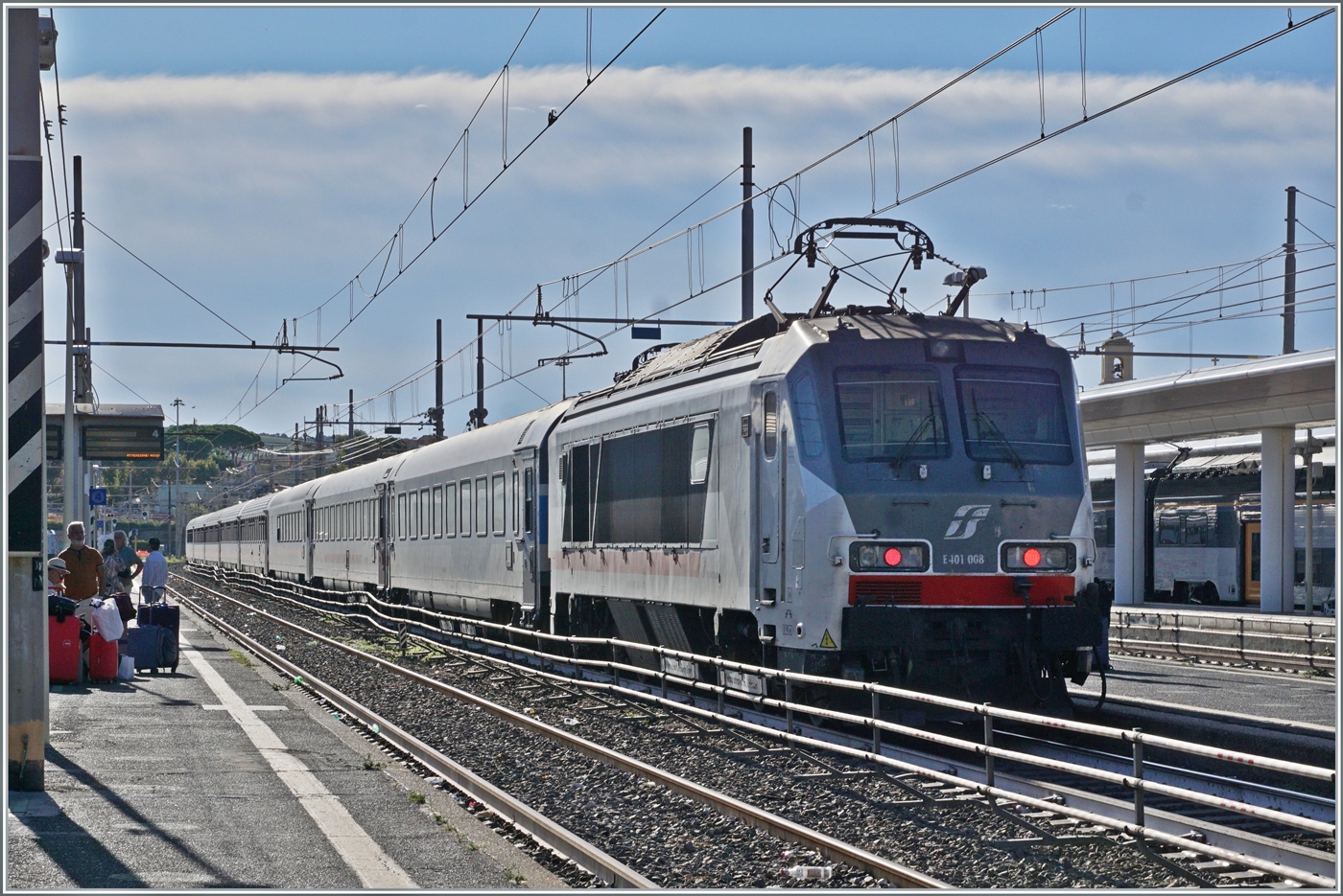 Die E 402.105 (91 83 2402 105-7 I-TI) eine E.402 B der Trenitalia (in grün-weißer Lackierung) steht am 23.07.2022 mit einem Trenitalia InterCity (IC) im Bahnhof Genova Piazza Principe. Am Zugschluss war eine weitere E.402 B.