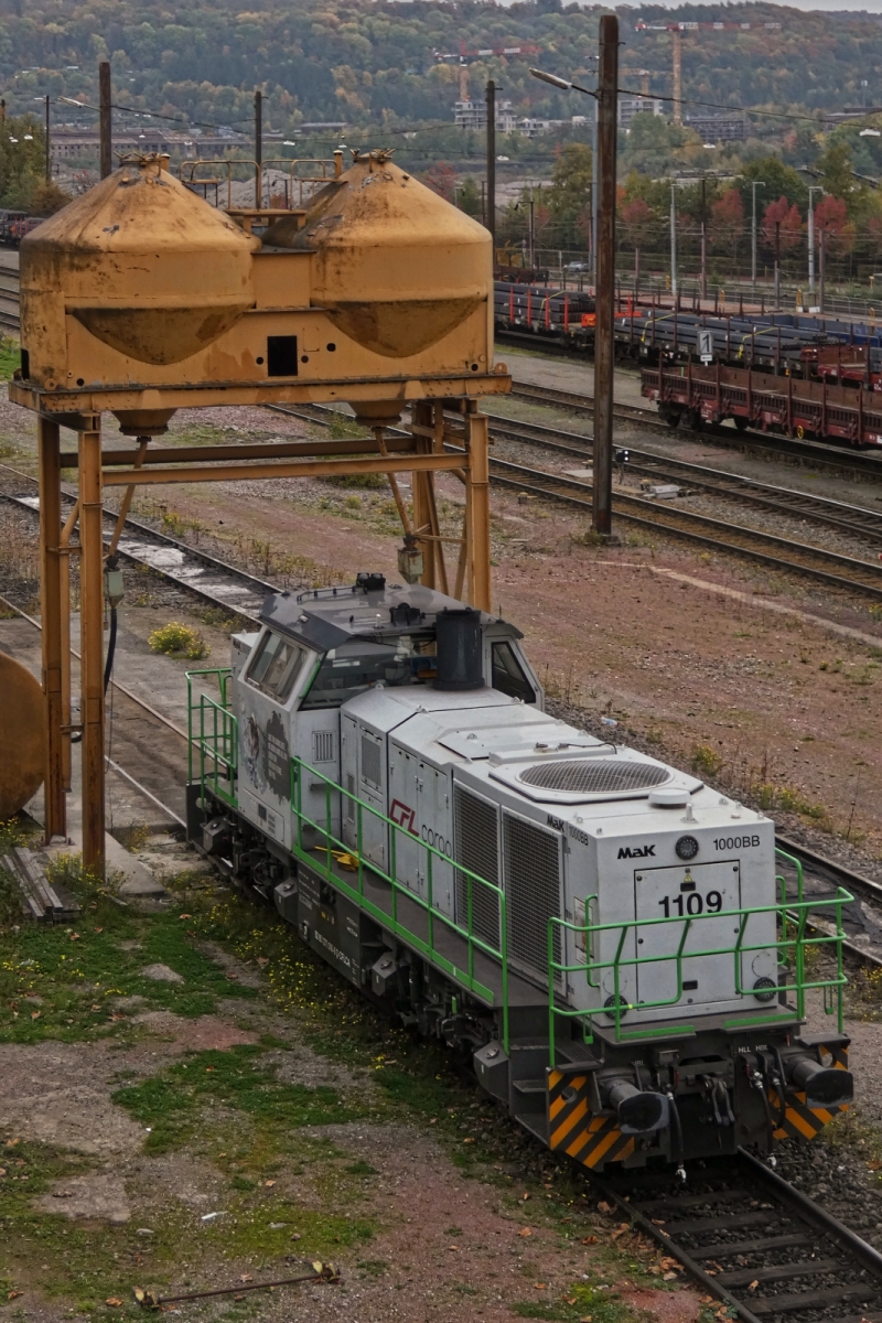 CFL Cargo 1109, rangiert in der Abstellung von Esch Belval, hier machte sie Halt und fuhr wieder zurück in die Abstellung. Aufgenommen vom Bahnsteig im Bahnhof Belval Université. 21.11.2025