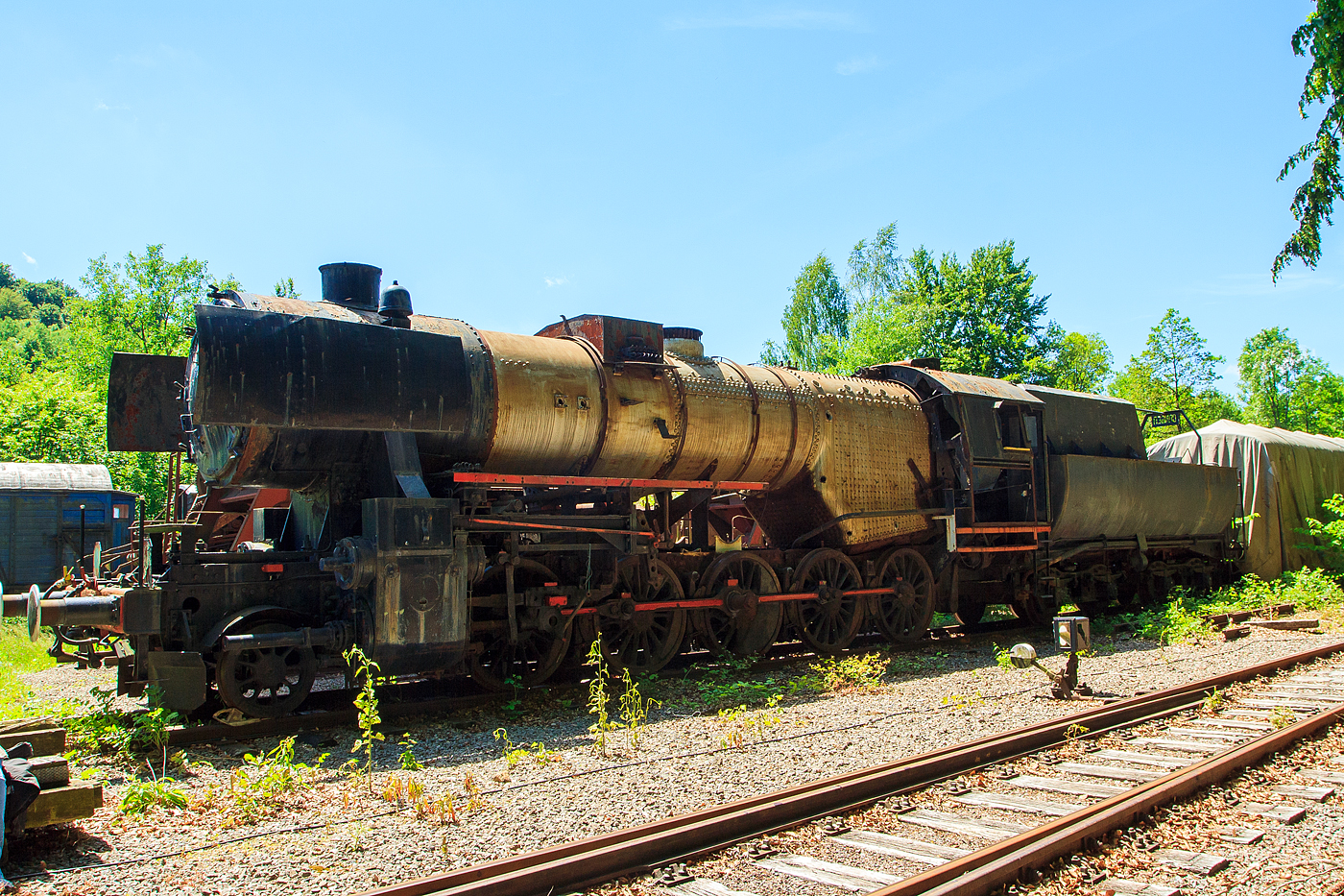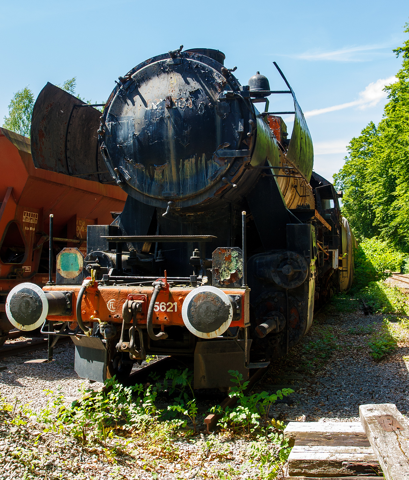 Damals (am 16 Juni 2013) leider einem sehr schlechten Zustand präsentierte sich die bei der AMTF - Association des Musée et Tourisme Ferroviaires a.s.b.l. (Train 1900) in Fond-de-Gras abgestellte CLF 5621 der SSMN - Service des Sites et Monuments Nationaux. Die Lok wurde 1943 von der Krauss-Maffei AG in München-Allach, als Kriegsdampflokomotive 1 (KDL 1) unter der Fabriknummer 16630 gebaut und als 52 3504 an die DRB (Deutsche Reichsbahn) geliefert. Nach dem 2. Weltkrieg verblieb sie in Österreich und wurde so zur ÖStB 52.3504 (Österreichische Staatseisenbahn) und ab August 1947 zur ÖBB 52.3504 (Österreichische Bundesbahnen). 1978 wurde die Lok durch die Vereinigung GAR - Groupement des Amis du Rail von der ÖBB übernommen. Nach ihrem Verkauf an die GAR wurde die Lok über mehrere Tage von Wien-Nord in das Bahnbetriebswerk Luxembourg überführt. Am 9.September 1978 wurde mit Hilfe der 215 072 die letzte Etappe von Ulm über Lauda und Mainz nach Luxemburg absolviert. Am 16. August 1980 wurde die Lok nach langer Abstellzeit wieder in Betrieb genommen. Nach der betriebsfähigen Aufarbeitung kam die Lok vom 6. September 1980 bis April 1981 vor Museumszügen bei der Chemin de Fer des Trois Vallées in Mariembourg (Belgien) zum Einsatz. Anschließend war die Lok von Mai 1982 bis Oktober 1984 bei der Merzig-Büschfelder Eisenbahn im Saarland im Einsatz. Schlussendlich wurde die Lok im Oktober 1984 nach Luxembourg rücküberführt, da die Revisionsfristen abgelaufen waren und die Lok aus dem Betrieb genommen wurden. Seither ist die Lok im Depot Luxembourg kalt abgestellt. 2004 wurde die Lok an die Service des Sites et Monuments Nationaux abgegeben. Eine Wiederinbetriebnahme der Lok ist auch in absehbarer Zukunft nicht vorgesehen. Von 2012 bis März 2021 stand die Lok im Depot der Vereinigung "Train 1900" in Fond-de-Gras. Am 26.März 2021 wurde die Lok von Fond-de-Gras nach Pétange in die Neubauhalle der SSMN - Service des Sites et Monuments Nationaux überführt. Hier wird sie wohl nun wieder etwas aufgearbeitet.
