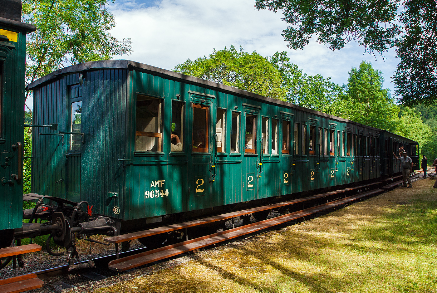 Der dreiachsiger Abteilwagen der zweiten Klasse AMTF 96544, ex SNCB/NMBS C 96544 der belgischen Staatseisenbahnen, der AMTF - Association des Musée et Tourisme Ferroviaires a.s.b.l. (Train 1900), eingereiht im Zugverband am 16 Juni 2013 im Industrie- und Eisenbahnpark Fond-de-Gras, hier in Bois de Rodange.