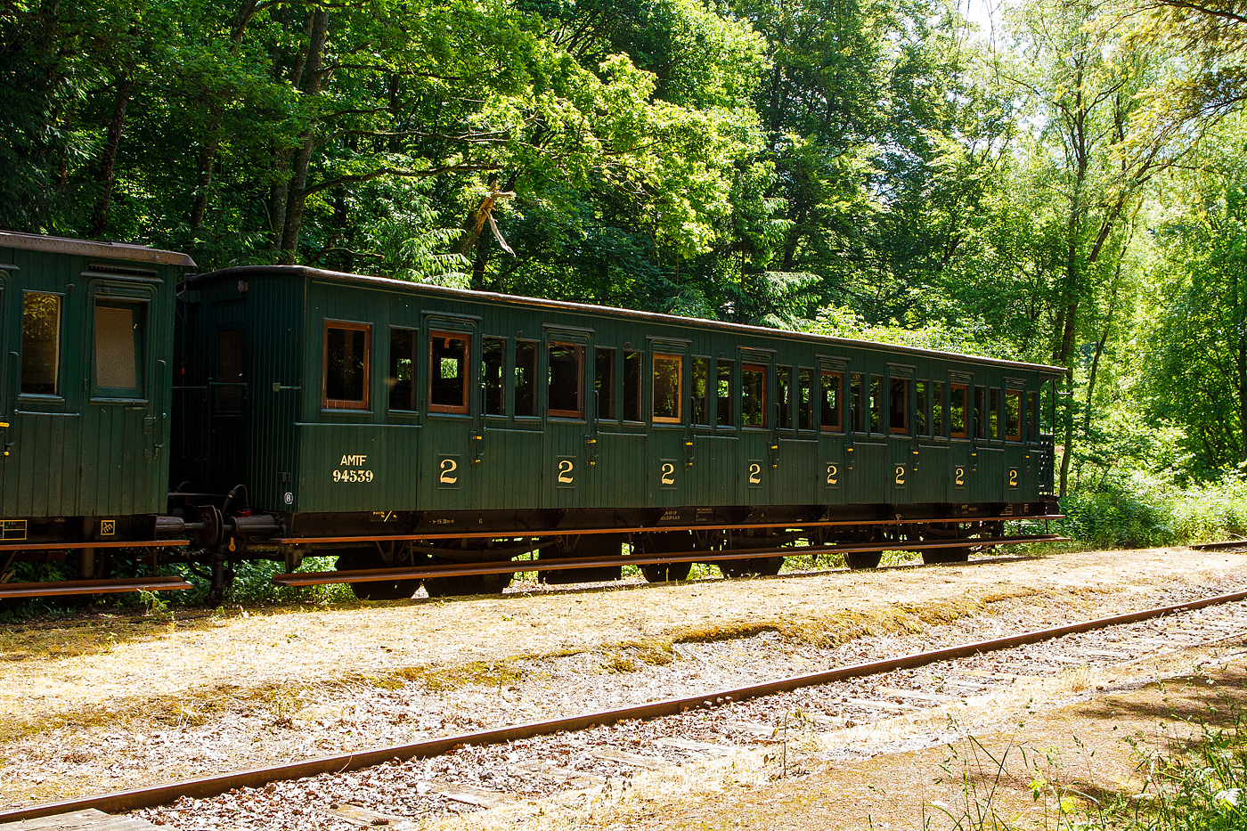 Der dreiachsiger Abteilwagen der zweiten Klasse mit einer Plattform AMTF 94539, ex SNCB/NMBS C 96539 der belgischen Staatseisenbahnen, der AMTF - Association des Musée et Tourisme Ferroviaires a.s.b.l. (Train 1900), eingereiht im Zugverband am 16 Juni 2013 im Industrie- und Eisenbahnpark Fond-de-Gras, hier beim Haltepunkt Fussbesch.